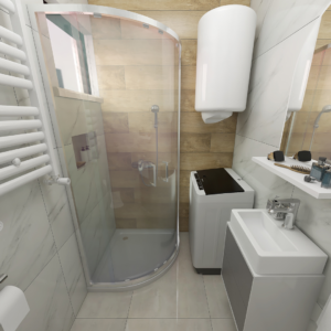 Na zidovima ovog 3D kupatila dominira pločica Athena Grey 60×120, struktura mermera. Na podu ovog 3D projekta nalazi se pločica Molde Light Grey 60×120. Detalji u nišama su predvidjeni od pločice Woodsense 20×120 koja ima teksturu drveta. Predvidjen je Turkuaz umivaonik Mini, Noura monoblok i WC daska Noura sa sistemom za sporo spuštanje takodje proizvođača Turkuaz. Česma je it serije Aroha, španskog prozivođača Galindo. U tuš kagini se nalazi baterija za tuš kadu sa ručnim tušem, domaćeg proizvođača Rosan. Predviđen je vertikalni bojler Talas i ogledalo iz PinoArt-ove ponude. KolpaSanov polukružni paravan i tuš kadica se nalaze u uglu ovog kupatila. Držač peškira, držač toalet papira i zidni držač četke su isto iz ponude sa našeg sajta: www.ceramica.co.rs