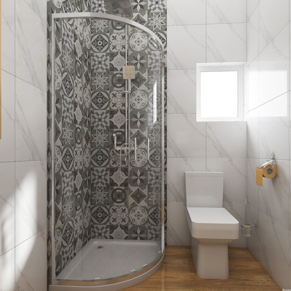 Prilikom izrade ovog projekta upotrebili smo tonove po želji našeg klijenta. Za ovo kupatilo predvideli kupatilski nameštaj u boji drveta (Duru Soft wood) kako bi se slagao sa podnim pločicama – imitacija drveta (španske pločice Berna Miel 120x20cm) koje su takođe po želji našeg klijenta. Na zidovima ovog kupatila, nalazi se pločica Fedra Blanco 45x45cm. U ovom projektu renoviranja kupatila, izbacili smo staru kadu i na njenom mestu predvideli smo KolpaSan tuš kabinu Eco Quat TKP od 80cm, da bi se dodatno oslobodio prostor u kupatilu. Uz tuš kabinu ide i odgovarajuća tuš kadica Evelin. Na zidu gde se nalazi tuš kabina, postavili smo dekorativne pločice Siena Antracit 60x60cm. Na tom zidu se nalazi i usponski tuš sa baterijom King, koje proizvodi u Srbiji. Naziv proizvođača je Rosan. Bojler smo premestili iznad mašine. Njegova zapremina je 80 litara i proizvodi ga Elit Inox iz Čačka. Konzolni ormarić i ogledalo sa led lampom su iz serije nameštaja koji smo prethodno naveli, a proizvodi ih Pino Art iz Užica. Uz njih ide i konzolna vertikala. Sva 3 proizvoda imaju sistem sa takozvanim mekim zatvaranjem vratanca. Radjeni su od kvalitetnih medijapan ploča koje imaju visoki stepen otpornosti na vlagu. Baterija za umivaonik nosi naziv Aroha, zemlja porekla je španija. U uglu pored tuš kabina nalazi se i monoblok Noura sa istoimenom WC daskom. Držač peškira, držač toalet papira i zidni držač četke su iz ponude sa našeg sajta Ceramica.