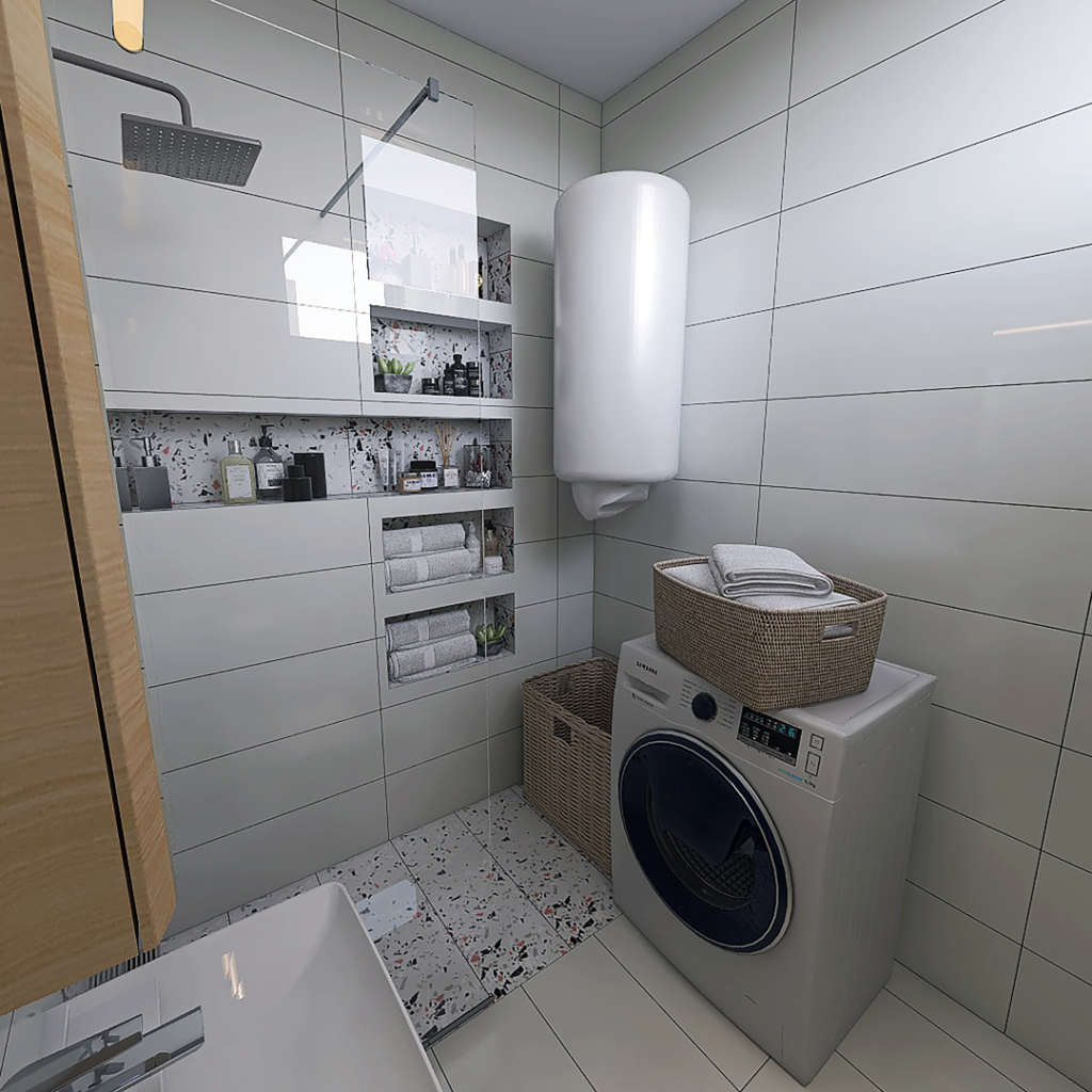 Kupatilo iz ovog 3D projekta, urađeno je u modernom stilu. Veći deo kupatila čine pločice Cersanit White Glossy 25x75cm. Druge pločice koje smo koristili su takođe iz Poljske, proizvodi ih Cersanit a njihov naziv je Essenza Flake Satin 25x75cm. Njih smo koristili kao dekor u Nišama. I u delu iza tuš stene. Naziv tuš stene je KolpSan Luna 80/K. Usponski tuš BGQ703 je crni i sa baterijom. On je iz ABR-ove ponude. Za odliv vode smo predvideli tuš kanalicu domaćeg proizvođača Alca Plast. Kupatilski nameštaj proizvodi Pino Art iz Užica. Naziv serije je Duru soft wood i za ovo kupatilo smo odabrali konzolni ormarić u kompletu sa umivaonikom, a iznad se nalazi ogledalo sa ormarićem iza i LED svetlom. Nameštaj je rađen od visoko kvalitetnih MDF ploča, a vratanca na ormariću i ogledalu su sa usporivačem za meko zatvaranje. Monoblok i WC dasku proizvodi turski brend CeraStyle. Oba proizvoda imaju isti naziv – Mona. WC daska je sa sistemom ze meko spuštanje (soft close). Pošto je ovo kupatilo manjih dimenzija, kako bi dodatno uštedeli na prostoru, odabrali smo horizontalni bojler Talas M od 80 litara, koji proizvodi Elit Inox iz Čačka. Držač papira, držač peškira, kao i držač za WC ćetku su iz ponude sa sajta ABR.