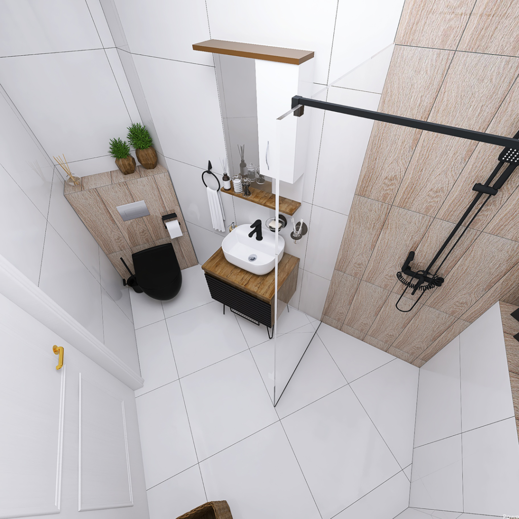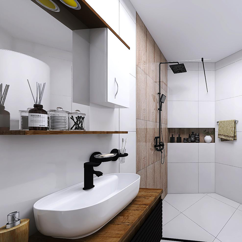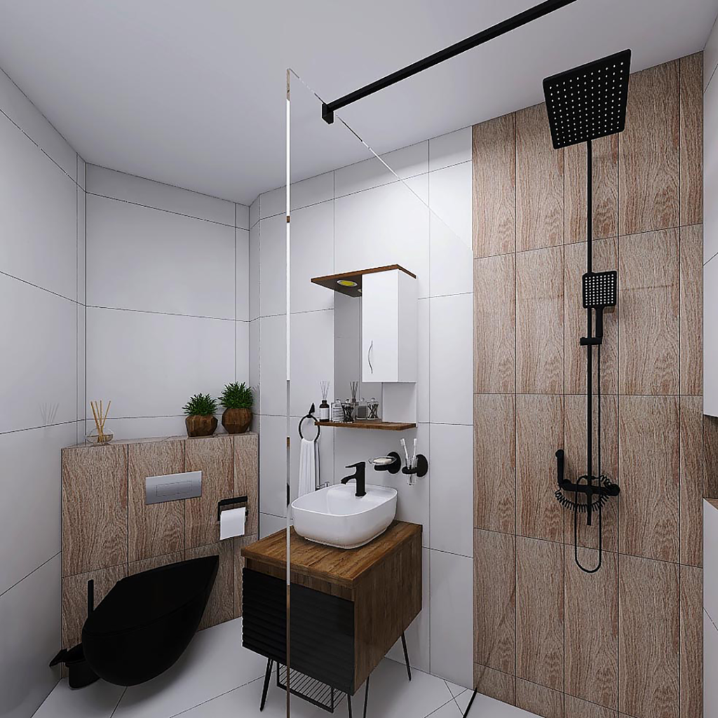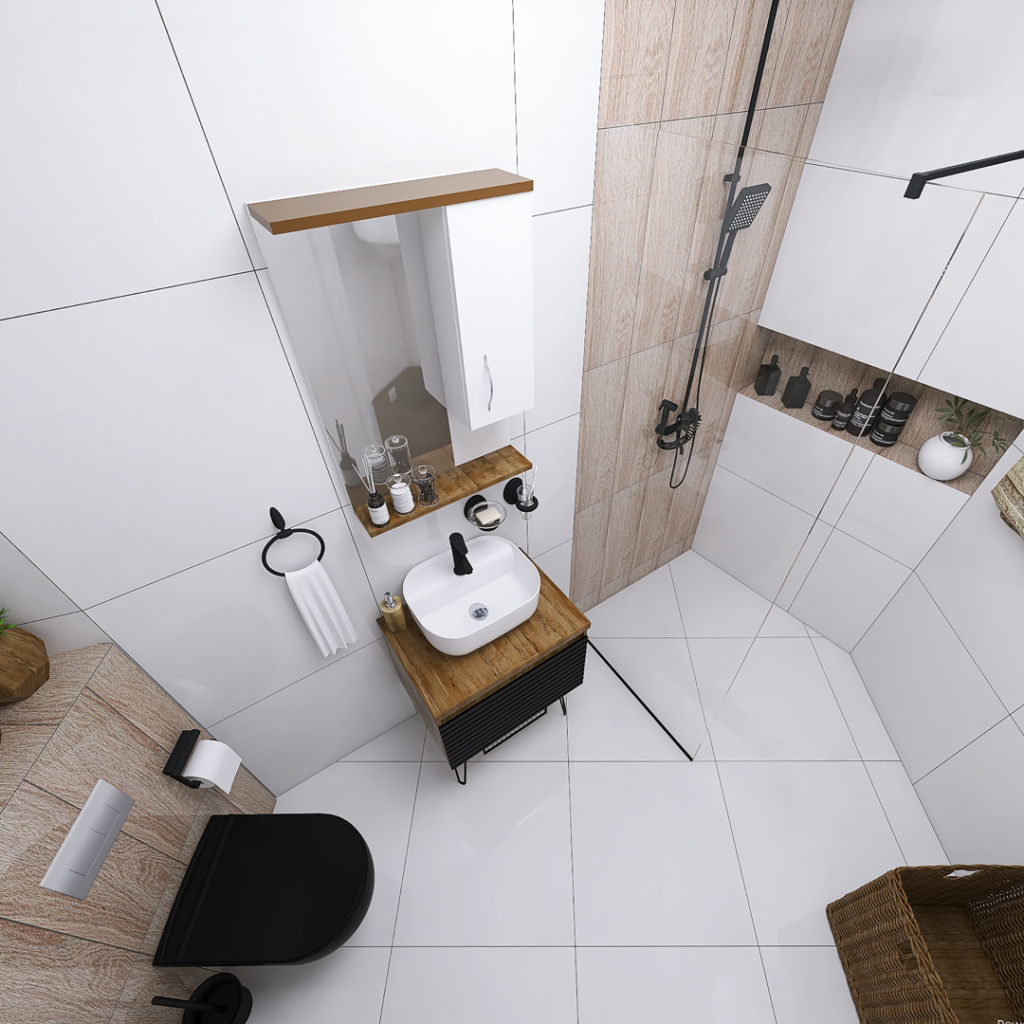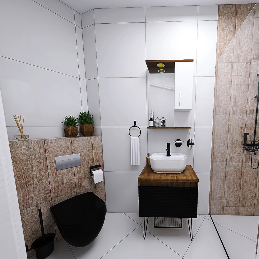 Kod ovog kupatila opredelili smo se za pločice renomiranih španski brendova STN i Balkania. Za oblaganje podova, odabrali smo Bonn Blanco pločice u dimenziji 60,8x 60,8 cm, ove iste pločice koristili smo i za oblaganje zidova a kao dekor iza šolje i kod tuš stene, koristili smo pločice Acacia Haya 20.5×6.15cm. Prilikom oblaganja podova i zidova keramikom kao spojno sredstvo preporučujemo lepak Adesilex P7. Za hidroizolaciju preporučujemo Mapegum WPS. Za sve spojeve pod-zid, zid-zid i dilatacione fuge preporučujemo obrađivanje gumenom trakom Mapeband. Svi ovi proizvoi su italijanskog proizvođača Mapei. Kao pregradu kod dela za tuširanje, koristili smo BP5717 Tuš stenu od 90cm iz ABR-ove ponude. Tu smo postavili još i Usponski tuš sa baterijom King J371251, a za odvod vode smo predvedeli tuš kanalicu sa prohromskom rešetkom, koju proizvodi Alca Plast. Pored dela za tuširanje, nalazi se kupatilski nameštaj, turskog brenda Denko Banyo. Ormarić sa umivaonikom Taylan 60 DB i ogledalo sa ormarićem Trend 60 DB. U uglu ovog kupatila se nalazi konzolna šolja u crnoj boji City rimless, sa ugradnim vodokotlićem Nil. Oba proizvoda su iz ponude turskog brenda CeraStyle. Ostatak kupatila čini kupatilska galanterija sa sajta CeramicaABR.