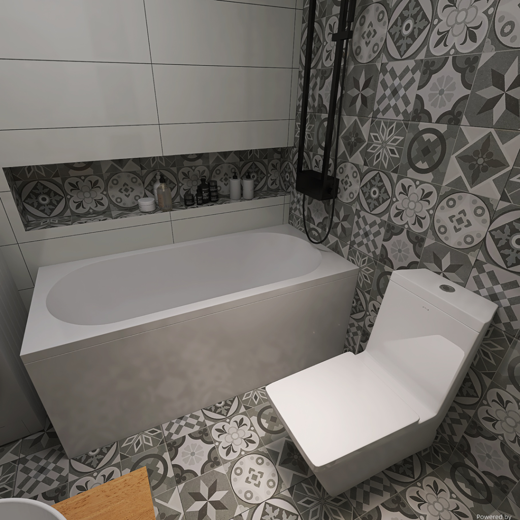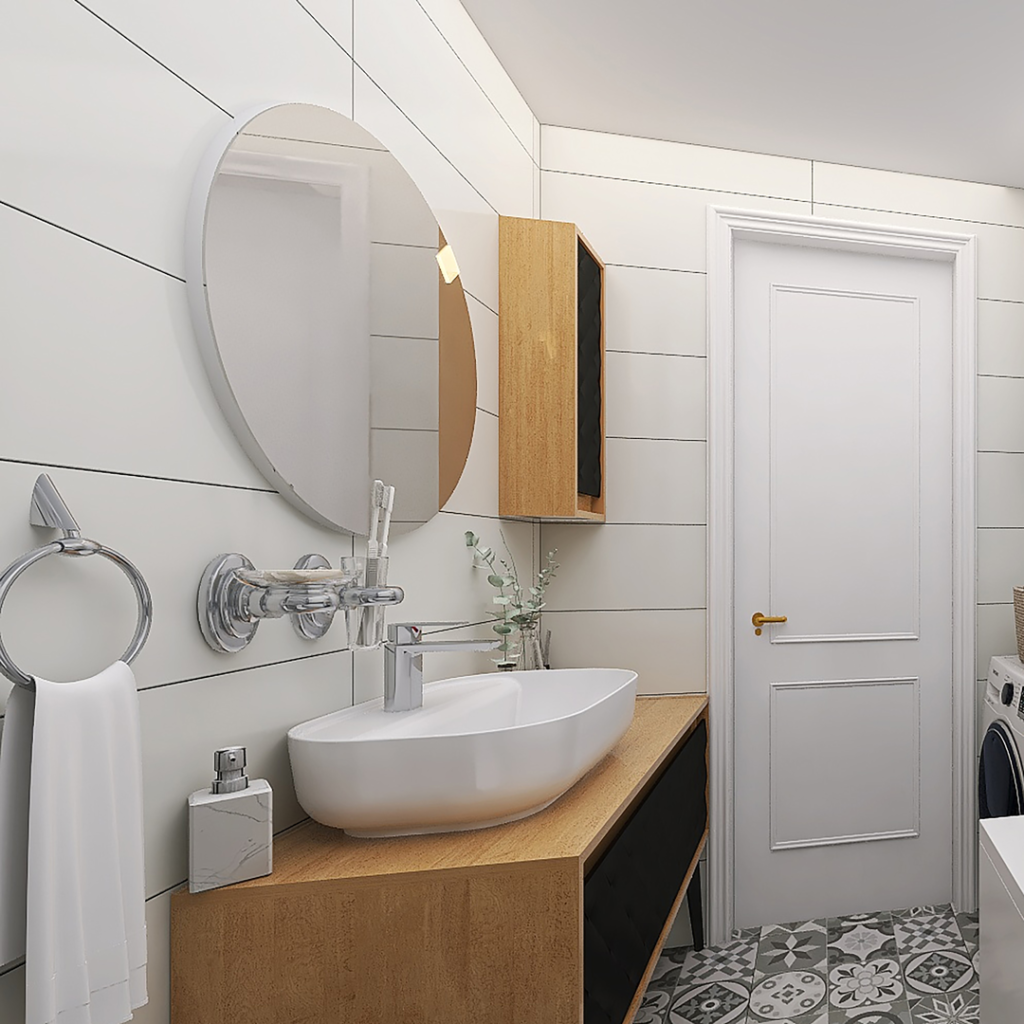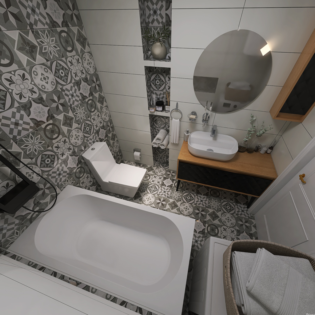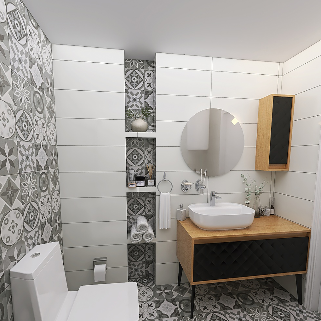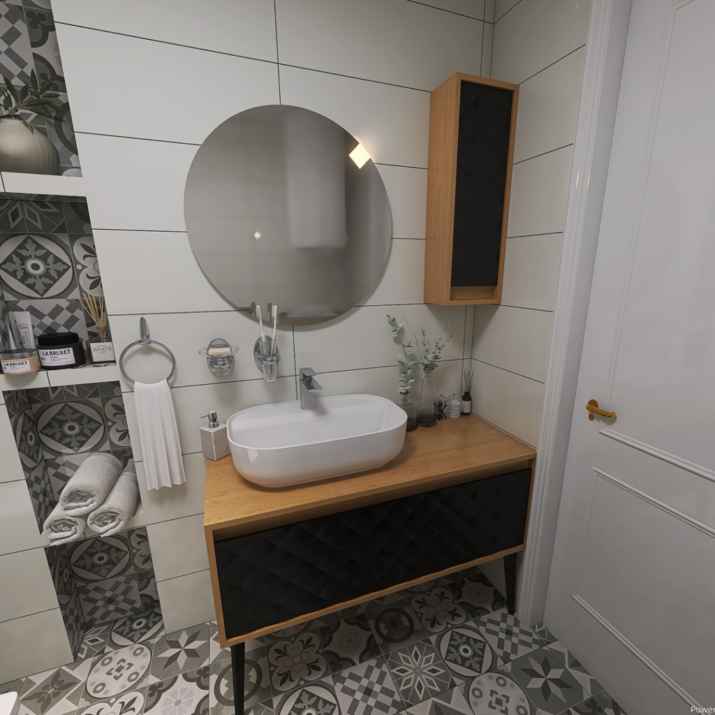 Prilikom izrade projekta za ovo kupatilo, raspored elemenata je promenjen u odnosu na trenutno stanje kako bi prostor bio funkcionalniji. Kupatilo iz ovog projekta rađeno je u rustičnom stilu. Kao dekor su korišćene pločice Siena Antracit 60x60cm, turskog proizvođača Etili, dok su na zidovima korišćene pločice White Glossy 25×75cm koje proizvodi Cersanit iz Poljske. Predviđena je implementacija niša u zidove kako bi se oformio prostor za odlaganje nekih stvari kao i da bi se vizuelno ulepšalo kupatilo. Monoblok Mona i WC daska Mona (sa sistemom za sporo spuštanje), postavljeni su na suprotnoj strani od ulaznih vrata. Oba proizvoda se nalaze u ponudi renomiranog turskog proizvođača Turkuaz. Nameštaj koji smo koristili u ovom projektu je iz serije MonArt, i ovu seriju nameštaja proizvodi Denko Banyo, ormarić dolazi u kompletu sa umivaonikom Aqua, turskog brenda CeraStyle. Iznad se nalazi ogledalo sa led svetlom, koje takođe ima naziv MonArt DB, i proizvodi ga takođe turski brend DenkoBanyo. Manji konzolni ormarć-vertikala koji se nalazi pored ogledala je iz iste serije, i od istog proizvođača. Baterija za umivaonik je iz serije Fresh, koju proizvodi Herz. Pored monobloka nalazi se akrilna kada koja dolazi u kompletu sa postoljem i oblogama. Njen naziv je Sidney150X70cm, a proizvodi je turski proizvođač Sanica. Iznad kade se nalazi crni usponski tuš sa baterijom BGQ070, iz ABR-ove ponude. Postavljen je i jedan vertikalni bojler, iznad veš mašine, zapremine 80litara. Držač peškira, držač toalet papira i zidni držač četke su iz ponude sa našeg sajta Ceramica.