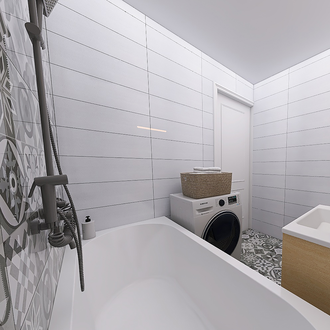 Na ostalim zidovima nalaze se pločice Opal Blanco 20×60. Prilikom oblaganja podova i zidova keramikom kao spojno sredstvo preporučujemo lepak Adesilex, koji proizvodi Mapei iz Italije. Ove pločice pripadaju španskom brendu Balkania. Od kupatilskog nameštaja tu su ormarić sa Latte DB sa umivaonikom Arte i ogledalo, koje je takođe iz serije Latte DB. Ovaj nameštaj proizvodi turski brend Denko Banyo. Baterija za umivaonik je iz serije Aroha, i nju proizvodi španski proizvođač Galindo. Pored ormarića sa umivaonikom nalazi se akrilna kada Roma 170x70cm koja dolazi u kompletu sa oblogama i postoljem i proizvodi je Polyagram iz Srbije. Iznad kade se nalazi jedan usponski tuš BGQ iz ABR-ove ponude. Horizontalni bojler Talas od 80 litara, nalazi se iznad kade, i njega proizvodi Elit Inox iz Čačka. Na drugoj strani kupatila nalazi se monoblok Duru sa WC daskom Duru, koja ima sistem sa sporim spuštanjem (soft close). Oba proizvoda pripadaju turskom brendu CeraStyle. Kupatilska galanterija je iz našeg online Web Shop-a.