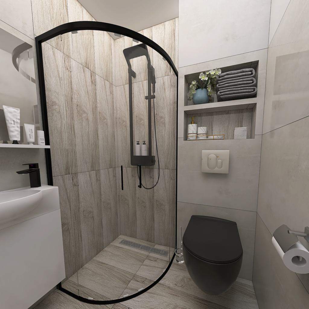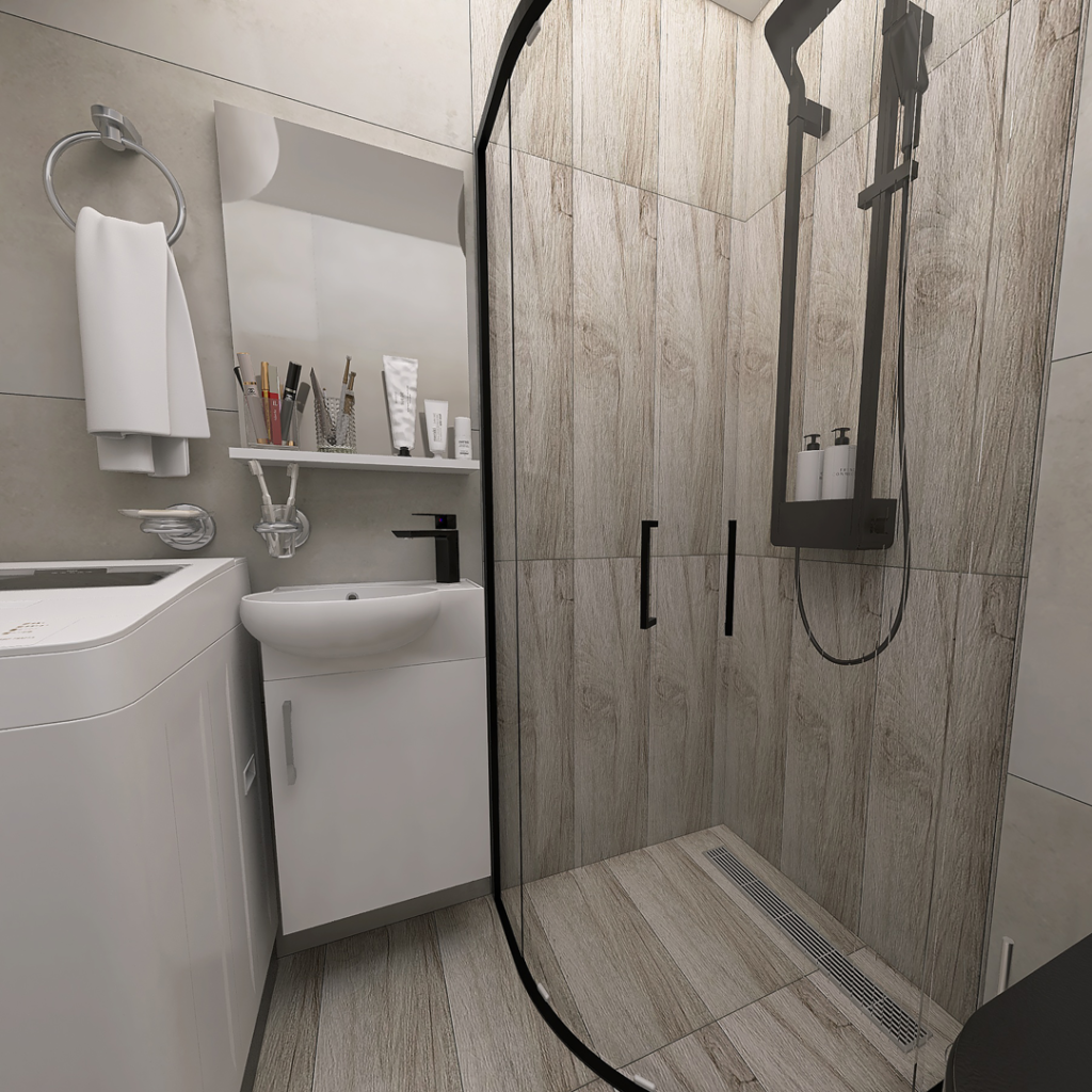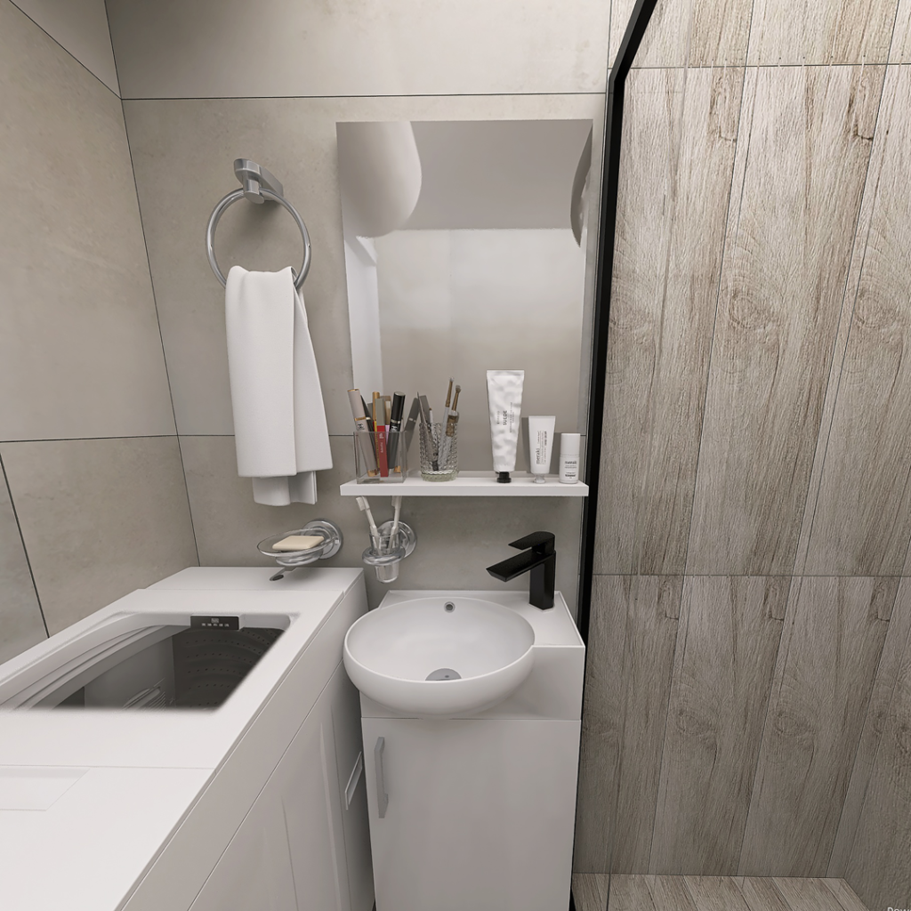 Kupatilo iz ovog 3D projekta je jako malih dimenzija i zbog jako malog prostora pored tuš kabine smešten je najmanji ormarić koji imamo u ponudi – Rio DB, širine 45cm, koji proizvodi Denko Banyo. U ovom projektu smo preporučili i veš mašinu koja se otvara na gore koja je takođe minimalnih dimenzija. Veća veš mašina bi prostor za lavabo smanjila toliko da prosto ne bi moglo da se pristupi pranju ruku. Kako bi prostor postao funkcionalan i kako bi pristup lavabou i ormariću bio koliko toliko normalan predvideli smo i polukružnu tuš kabinu Eco Quat sa crnim okvirom takođe minimalnih dimenzija 80cm. Unutra se nalazi i crni usponski tuš BGQ, dok je na pod za odvod vode postavljena tuš kanalica sa prohromskom rešetkom. Zbog položaja vrata i konzolne šolje ne preporučujemo eventualno premeštanje lavaboa na suprotan zid. Konzolna šolja City je takođe u crnoj boji i proizvodi je turski brend CeraStyle, kao i ugradni vodokotlić Nil, koji se nalazi iza nje. Od pločica smo koristili Sauco Gris, koje imaju teksturu i izgled drveta. Njih proizvodi STN iz Španije. A druge pločice koje smo koristili nose naziv Molde Light, i njih proizvodi Etili iz Turske. Baterija za umivaonik je takođe u crnoj boji, i pripada seriji Aroha, a proizvodi se u Španiji. Pošto je kupatilo iz ovog 3D projekta malih dimenzija, postavili smo horizontalni bojler od 80l iznad veš mašine. Ovaj bojler proizvodi Elit Inox iz Čačka. Držač peškira, držač toalet papira i zidni držač četke su iz ponude sa našeg sajta Ceramica.