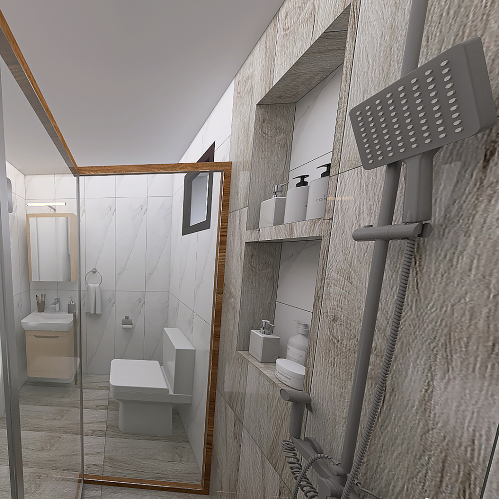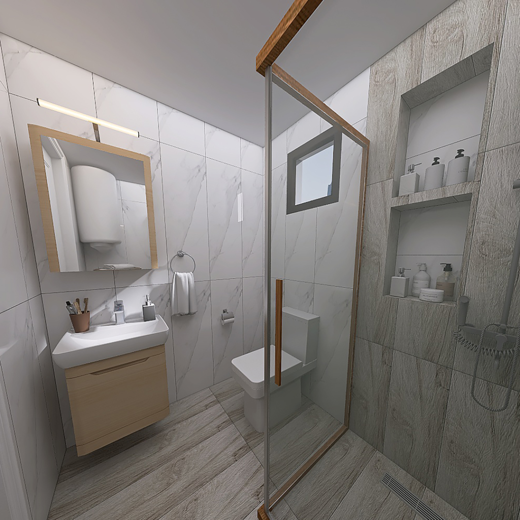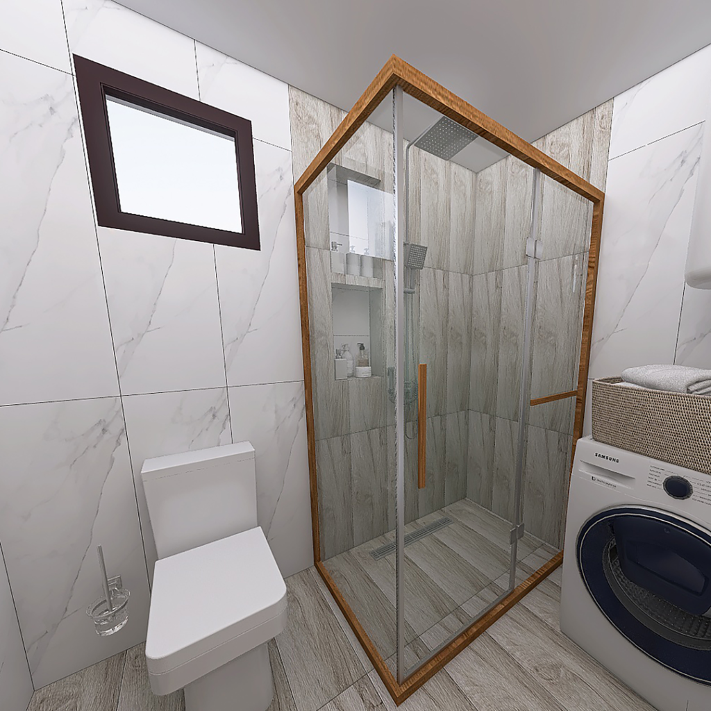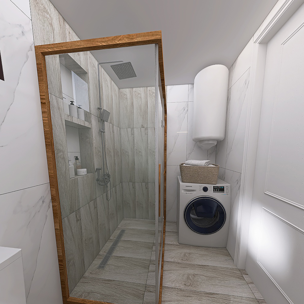 Danas vam predstavljamo 3D projekat kupatila koji je rađen sa pločicama koje predstavljaju imitaciju drveta. Ove pločice se proizvode u Španiji i njihov naziv je Sauco Gris 24x95cm. Uz njih smo kombinovali bele pločice sa šarom mermera. Njihov naziv je Duomo Blanco 33x100cm. Obe pločice pripadaju brendu STN Ceramica iz Španije. Tuš paravan TEAK 120x80cm, pripada turskom Brendu Pakdus, i okvir se proizvodi od drveta – tikovine. Za odvod vode je postavljen linearni slivnik sa prohromskom rešetkom, dok se iznad nalazi usponski tuš sa baterijom King. Ovaj tuš i bateriju proizvodi domaći brend Rosan. U ovom kupatilu lavabo je u kompletu sa ormarićem i to iz serije Duru Soft. Iznad se nalazi ogledalo sa ormarićem i LED lampom. Oba ova ormarića imaju usporivače za meko zatvaranje vratanca i radjeni su od MDF ploča koje imaju visok stepen otopronosti na vlagu. Proizvodi ih PinoArt iz Užica. Baterija za umivaonik je iz serije Aroha, španskog proizvođača Galindo. Umesto WC šolje, opredelili smo se za Turkuazov monoblok Noura. Uz monoblok ide i WC daska Noura, koja ima takozvani Soft Close sistem (sistem za sporo spuštanje). U ovom kupatilu smo postavili i jedan vertikalni bojler od 80 litara, dok smo od kupatilske galanterije postavili Držač rolo papira, držač WC četke i držač za peškir. Kupatilska galanterija i bojler su iz naše online ponude.