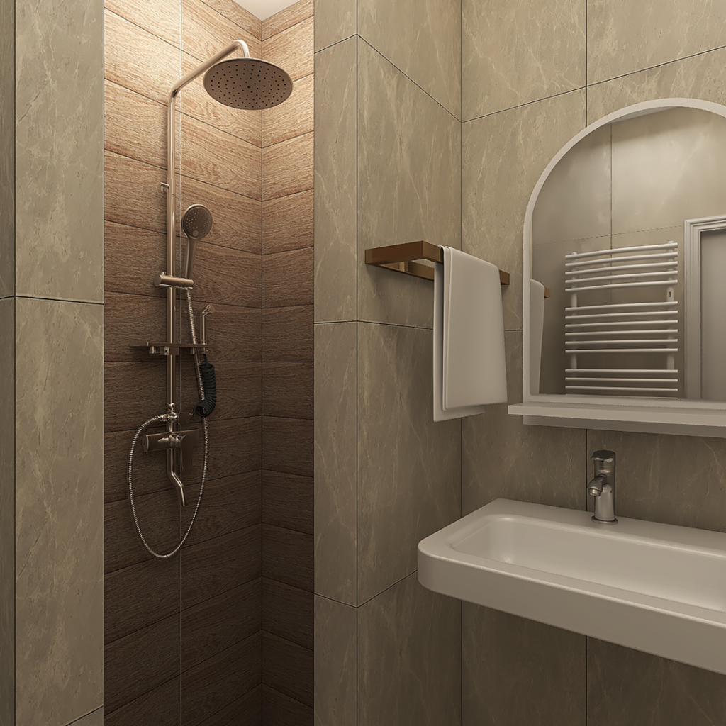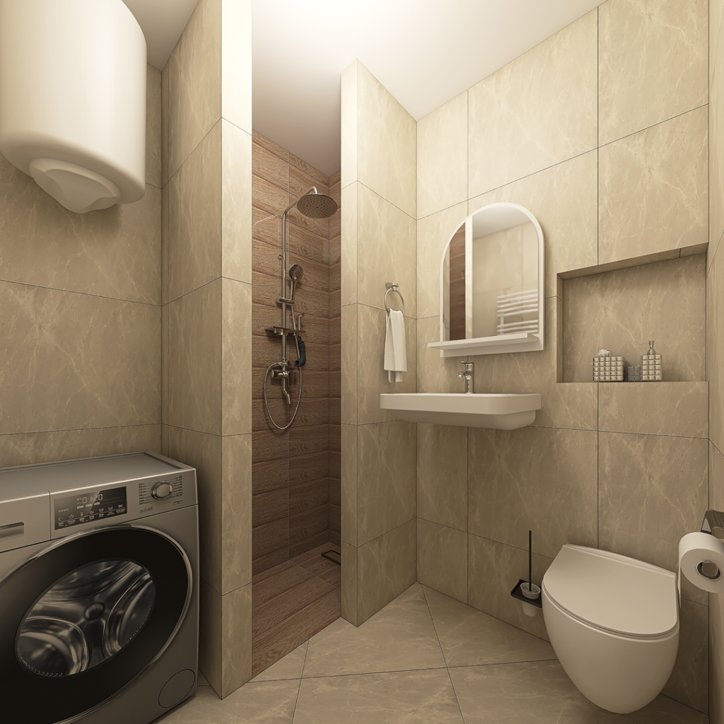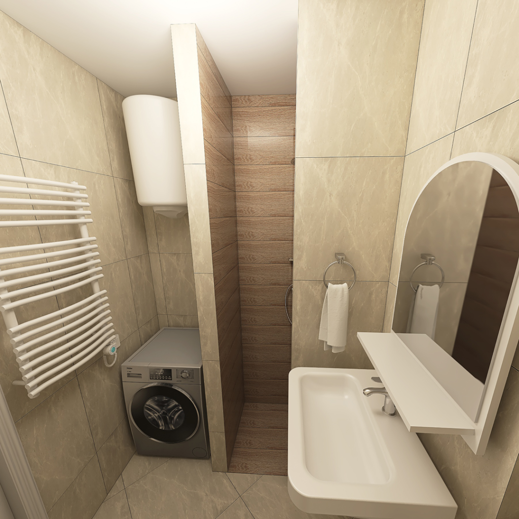 Na zidovima ovog kupatila nalaze se pločice Spider Beige, dok se u delu za tuširanje nalaze pločice Acacia Haya, na zidu kao i na podu. A ostali deo kupatila na podu ima pločice Speider Beige u podnoj varijanti. Pločice Acacia Haya proizvodi STN iz Španije, dok pločice Spider Beige proizvodi Etili keramika iz Turske. U delu za tuširanje nalazi se usponski tuš Waterfall, sa baterijom iz serije Fresh, a proizvodi ih Herz. Ispod usponskog tuša se nalazi ACO Classic kanalica za tuš, koja dolazi u kompletu sa rešetkom. Ugradni vodoktlić (Nil) i konzolna WC šolja (City rimless) su renomiranog turskog proizvođača Turkuaz. Iznad ugradnog vodoktlića Nil, odlučili smo se za jednu manju nišu, kako bi dodatno iskoristili prostor za odlaganje kupatilske galanterije. Umivaonik je od istog proizvođača, a njegov naziv je Noura i dimenzije su mu 60x48cm. Baterija za lavabo je španskog proizvođača Galindo, a naziv serije je Aroha. Iznad umivaonika, nalazi se Pino Artovo ogledalo Mini Etažer. U uglu ovog kupatila se nalazi Elit Inox-ov bojler od 60 litara – Talas M60. Ostatak kupatila čini kupatilska galanterija sa sajta CeramicaABR.