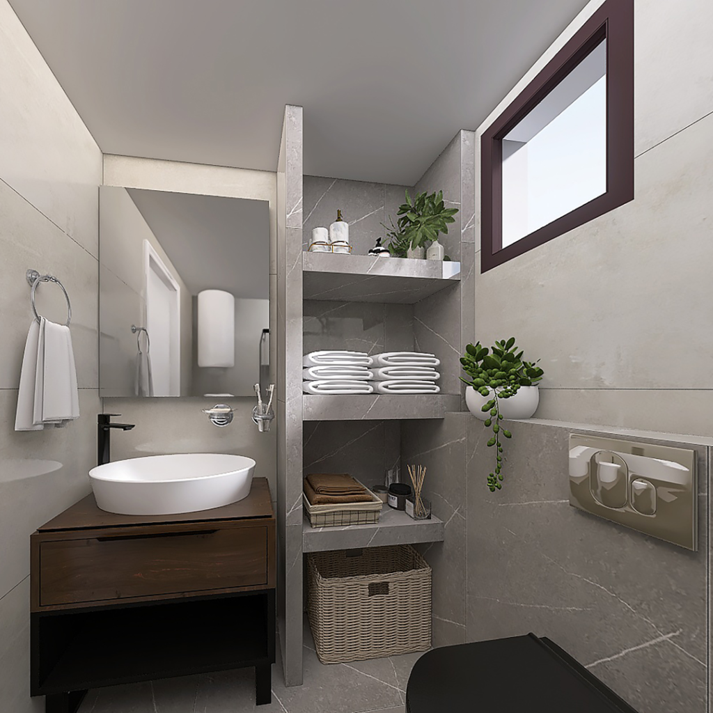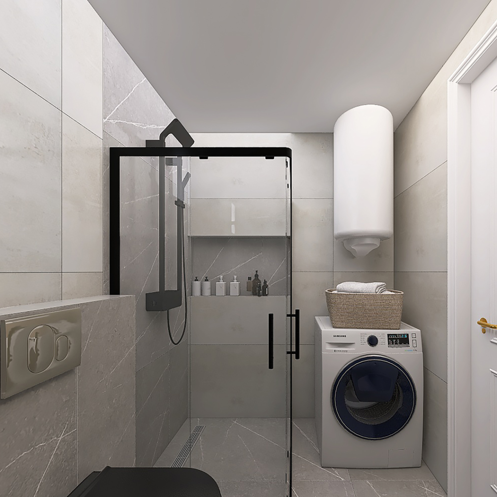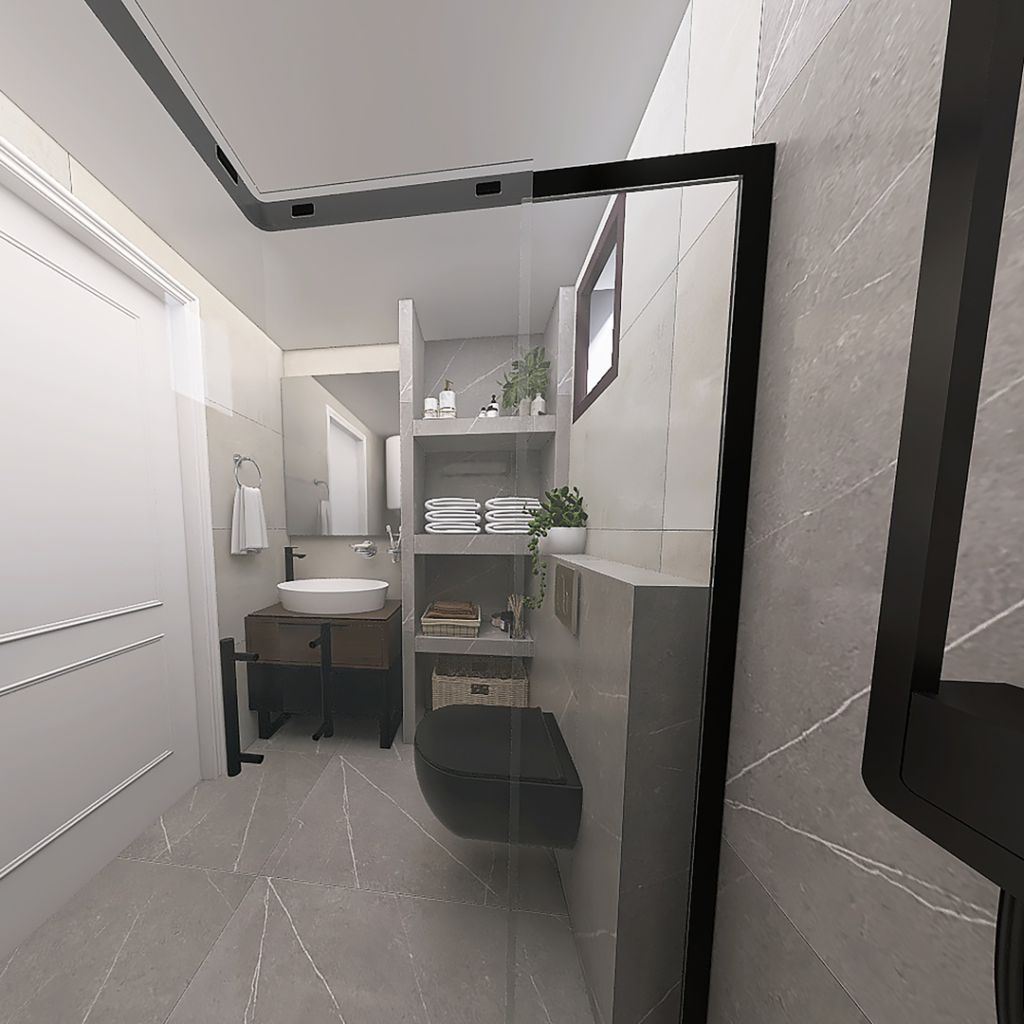 Prilikom izrade projekta za ovo kupatila, raspored elemenata je korigovan tako što je konzolna šolja smeštena bliže paravanu da bi se formirao prostor za police. Pedviđeno je i oblaganje novoformiranih polica pločicama. Kombinovanjem pločica u sivim tonovima sa crnim elementima formira se moderno uređen prostor. Opredelili smo se za pločice Molde Light, koje proizvodi Etili i za pločice Tactile Grey, koje proizvodi STN iz Španije. Prilikom oblaganja podova i zidova keramikom kao spojno sredstvo preporučujemo lepak Adesilex P7. Za hidroizolaciju preporučujemo Mapegum WPS. Za sve spojeve pod-zid, zid-zid i dilatacione fuge preporučujemo obrađivanje gumenom trakom Mapeband. Svi ovi proizvoi su italijanskog proizvođača Mapei. Kupatilski nameštaj pripada seriji Bella Dona, i proizvodi ga Kubis iz Mladenovca. Uz ormarić ide i jedan umivaonik One od 67cm, sa povišeno baterijom S2 Black, koju proizvodi Rosan. Sanitarija je iz ponude turskog brenda CeraStyle. Ovog puta smo se odlučili za konzolnu šolju City u crnoj boji, sa crnom WC daskom City, dok je ugradni vodokotlić iz serije Nil. U uglu se nalazi Eco Quat TKK, tuš paravan sa crnim okvirom, koji proizvodi Kolpa iz Slovenije. Unutra se nalazi usponski tuš u crnoj boji sa baterijom, BGQ070, dok je za odvod vode postavljen linearni slivnik sa prohromskom rešetkom, koji proizvodi Alca Plast. Vertikalni bojler od 80litara, držač rolo papira, držač WC četke i držač za peškir su iz naše online ponude.