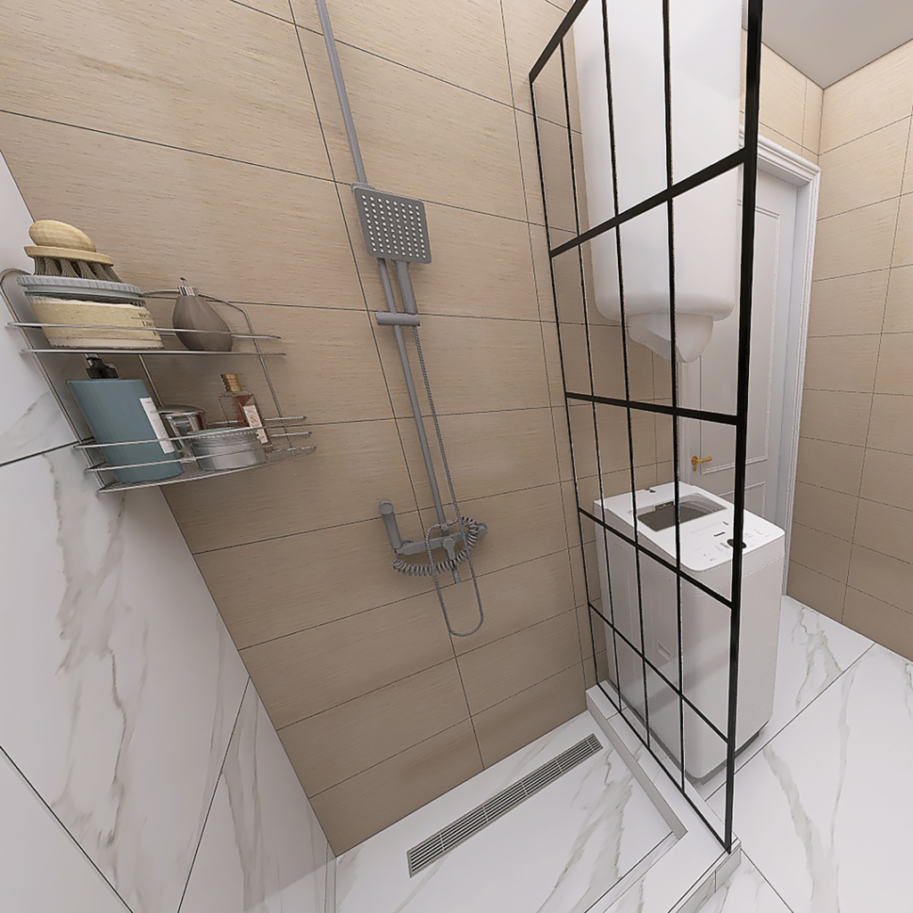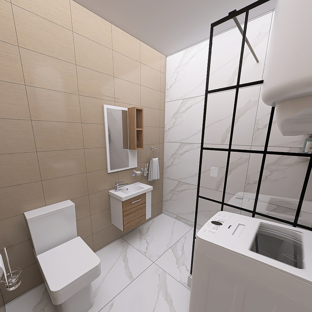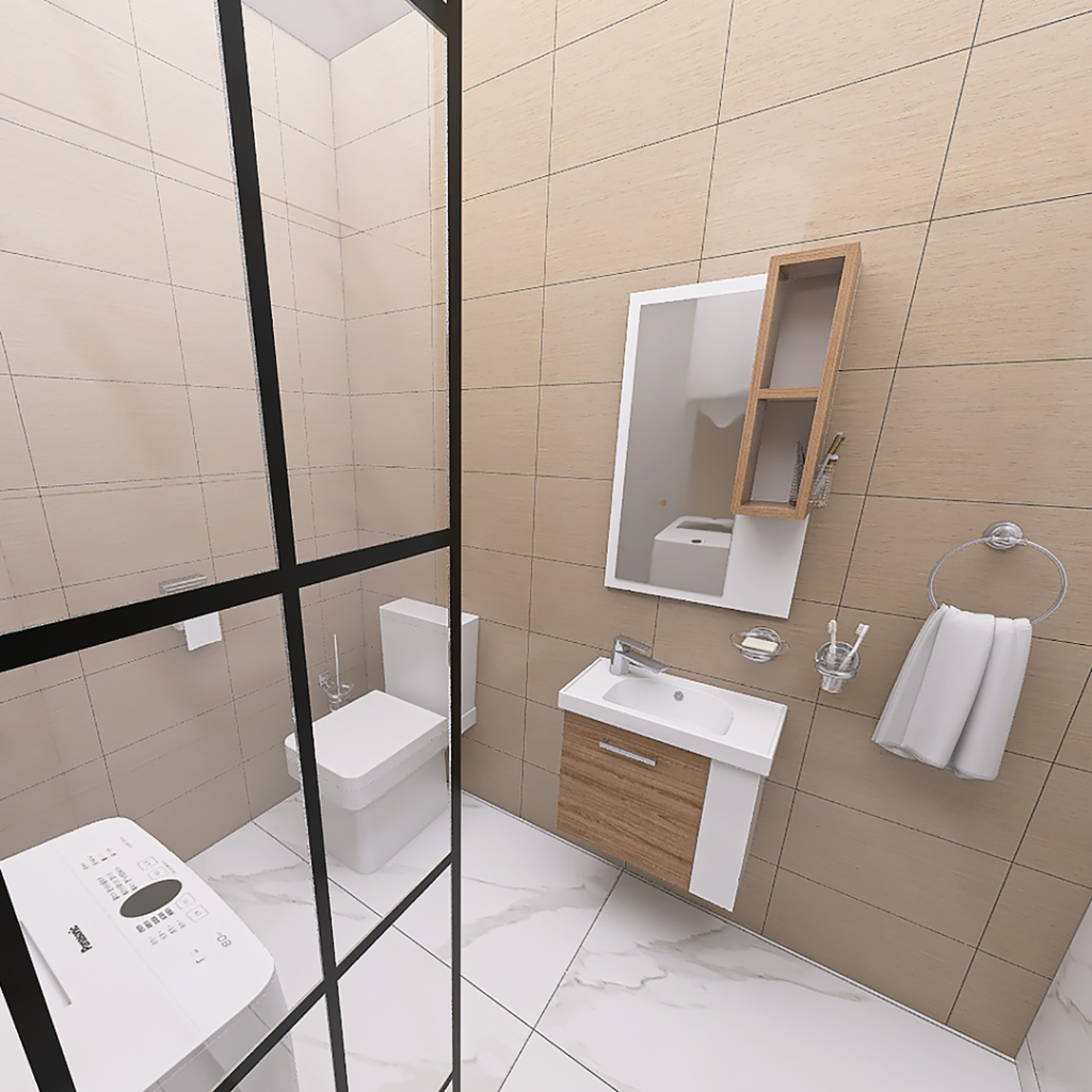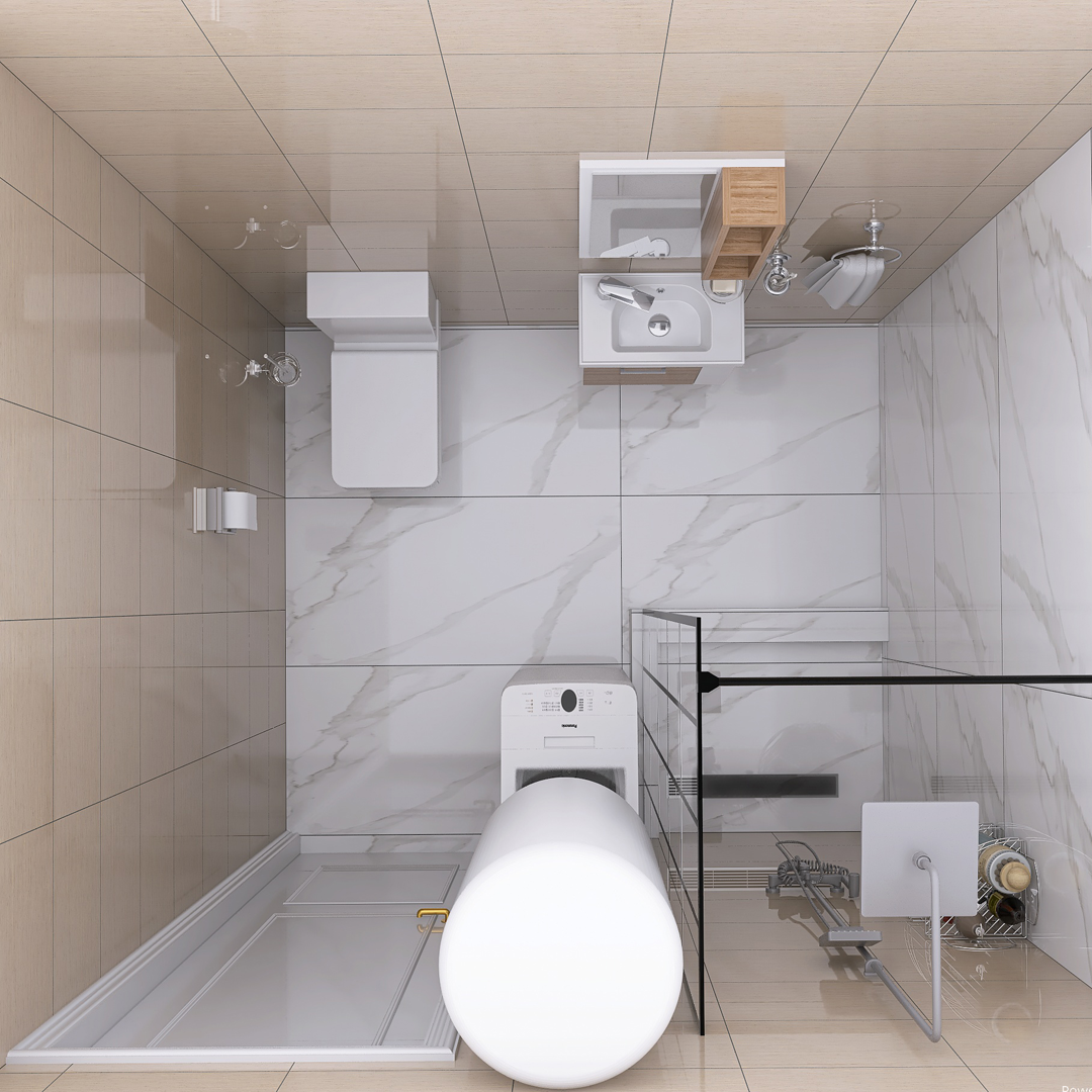 Zbog jako malih dimenzija kupaila, kombinovani su elementi minimlnih dimenzija kako bi prostor ostao funcionlan. Od kupatilskog nameštaja odabrali smo mali ormarić Step DB sa umivaonikom Frame i ogledalo, koje je takođe iz serije Step DB. Ovaj nameštaj proizvodi turski brend Denko Banyo. Baterija za umivaonik je iz serije Aroha, i nju proizvodi španski proizvođač Galindo. Za ovaj 3D projekat, predvidjena je uska mašinaza veš sa otvaranjem na gore i bojler koji ide iznad nje. Kombinovane su tamno braon pločice (Kalliope Dark Beige) sa pločicama koje su imitacija mermera (Duomo Blanco) kako bi se postigao kontrast i kako bi sam prostor bio vizuelno lepši. Umesto konzolne šolje stavljen je Turkuazov monoblok Duru kako parapetni zid ne bi dodatno smanjio prostor. Preko puta monobloka nalazi se fiksna staklena pregrada, takozvana tuš stena i njena oznaka je BP5717, a širina je 80cm. Unutra se nalazi usponski tuš sa baterijom, a za odvod vode postavljen je linearni slivnik sa prohormskom rešetkom. Bateriju i usponski tuš proizvodi Rosan, dok linearni slivnik proizvodi Alca Plast. Držač papira, držač peškira, kao i držač za WC četku su iz ponude sa sajta CeramicaABR.