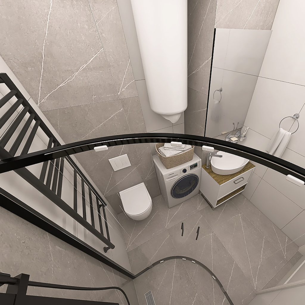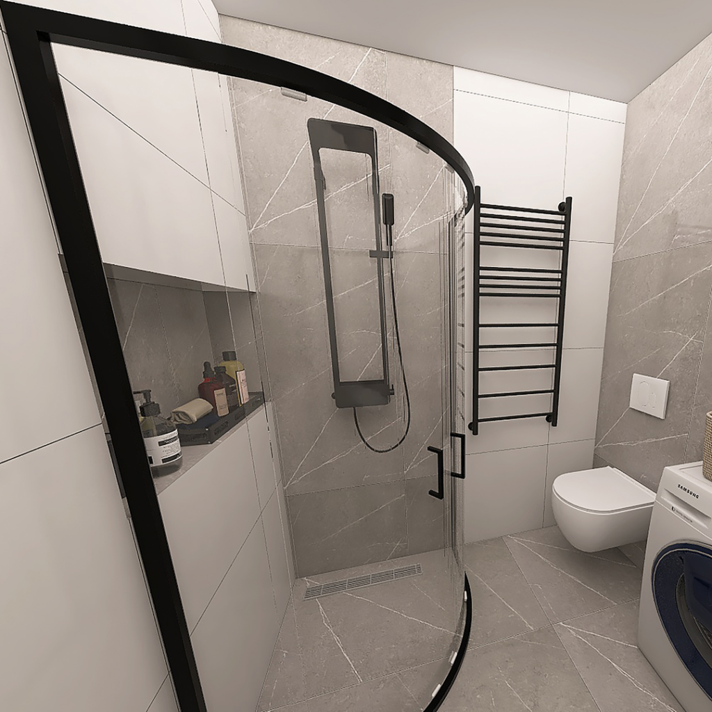 Za naglašavanje određenih delova kupatila, predviđena je primena tamno sivih pločica u kombinaciji sa belim pločicamuz koje ide moderan kupatilski nameštaj i sanitarija. U ovom kupatilu predvidjen je parapetni zid za konzolnu šolju City Rimless sa visinom od 2,5m, tuš kabina Eco Quat TKP dimenzija 90x90cm i ormaric Bella Dona sa lavaboom One širine 70cm. Konzolnu šolju, wc dasku, ugradni vodokotlić Nil i lavabo One, proizvodi turski brend CeraStyle, dok kupatilski nameštaj- ogledalo i ormarić proizvodi Kubis iz Mladenovca. Pozicija vertikalnog bojlera od 80 litara je predvidjena iznad veš mašine kako bi što manje vizuelno remetio prostor. Unutar tuš kabine nalazi se jedna niša manjih dimenzija, za odlaganje kupatilskih sitnica. Pored nje se nalazi crni usponski tuš BGQ iz naše ponude, koji dolazi u kompletu sa baterijom, tuš crevom kao i ručnim tušem. Ispod tuša, za odvod vode postavljena je tuš kanalica (linearni slivnik) sa prohromskom rešetkom, koji proizvodi Alca Plast. Kupatilska galanterija u ovom projektu je iz naše bogate ponude, dok je povišena baterija za umivaonik iz serije Fresh, i nalazi se u ponudi slovenačkog proizvođača Herz.