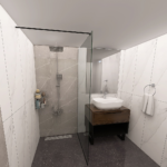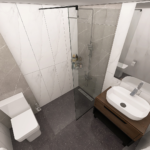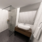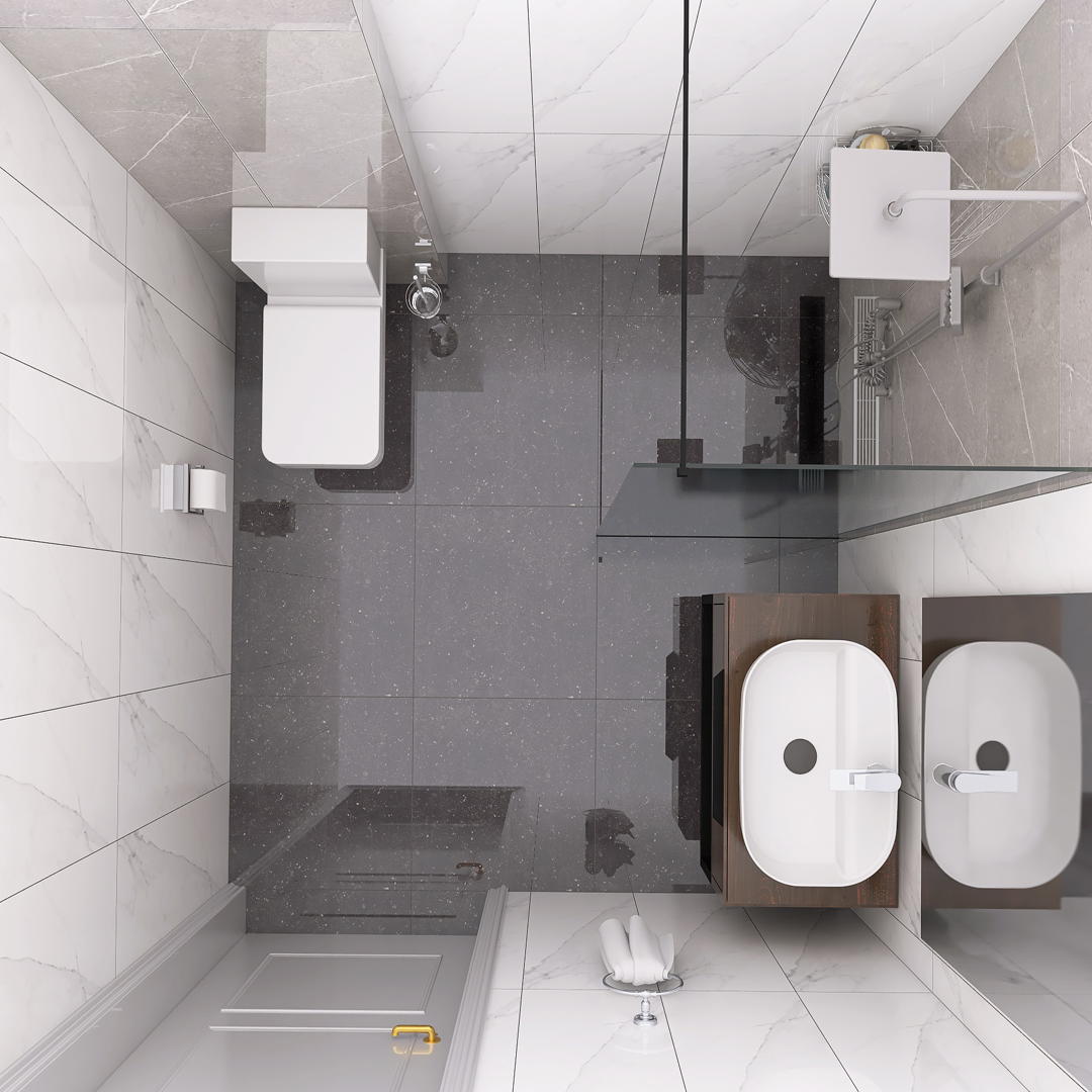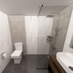 Danas vam predstavljamo projekat koji je rađen sa pločicama koje predstavljaju imitaciju mermera. Za ovaj projekat smo koristili pločice u belim sivim i crnim tonovima. Nazivi ovih pločica su Duomo Blanco, Tactile Grey i Cartuja Negro. Sva tri modela proizvode se u španiji i pripadaju brendovim STN i Keros. Naša preporuka je da se prilikom oblaganja podova i zidova keramikom kao spojno sredstvo koristi lepak Adesilex P7 Extra, dok se kod fugovanja preporučuje korišćenje fug mase Keracolor FF. Ova fug masa i lepak za keramiku, nalaze se u Mapeijevoj ponudi i proizvode se u Italiji. Zbog izuzetno malih dienzija kupatila predvidjena je fiksna staklena pregrada – tuš stena dimenzija 80/195cm kako bi mogla da se postavi u prostor a da on ostane funkcionalan. Unutra se nalazi žičana ugaona polica, usponski tuš sa baterijom King, a za odvod vode je predviđen linearni slivnik sa prohromskom rešetkom, koji proizvodi Alca plast. Usponski tuš se proizvodi u Rosanovoj fabrici u Srbiji. Žičana ugaona polica, kao i ostala galanterija, je iz naše onlajn prodavnice. Umesto klasične WC šolje, opredelili smo se za monoblok Duru sa istoimenom WC daskom. Ova dva proizvoda pripadaju turskom brendu CeraStyle. Ovom brendu pripada i umivaonik Aqua 60x40cm. Ispod umivaonika nalazi se ormarić Bella Dona K, dok se iznad umivaonika nalazi ogledalo iz iste serije. Ovu seriju kupatilskog nameštaja proizvodi Kubis keramika iz Mladenovca. Baterija za umivaonik je iz serije koja nosi naziv Aroha, oznaka modela je 4605000, a proizvodi je španski brend Galindo.