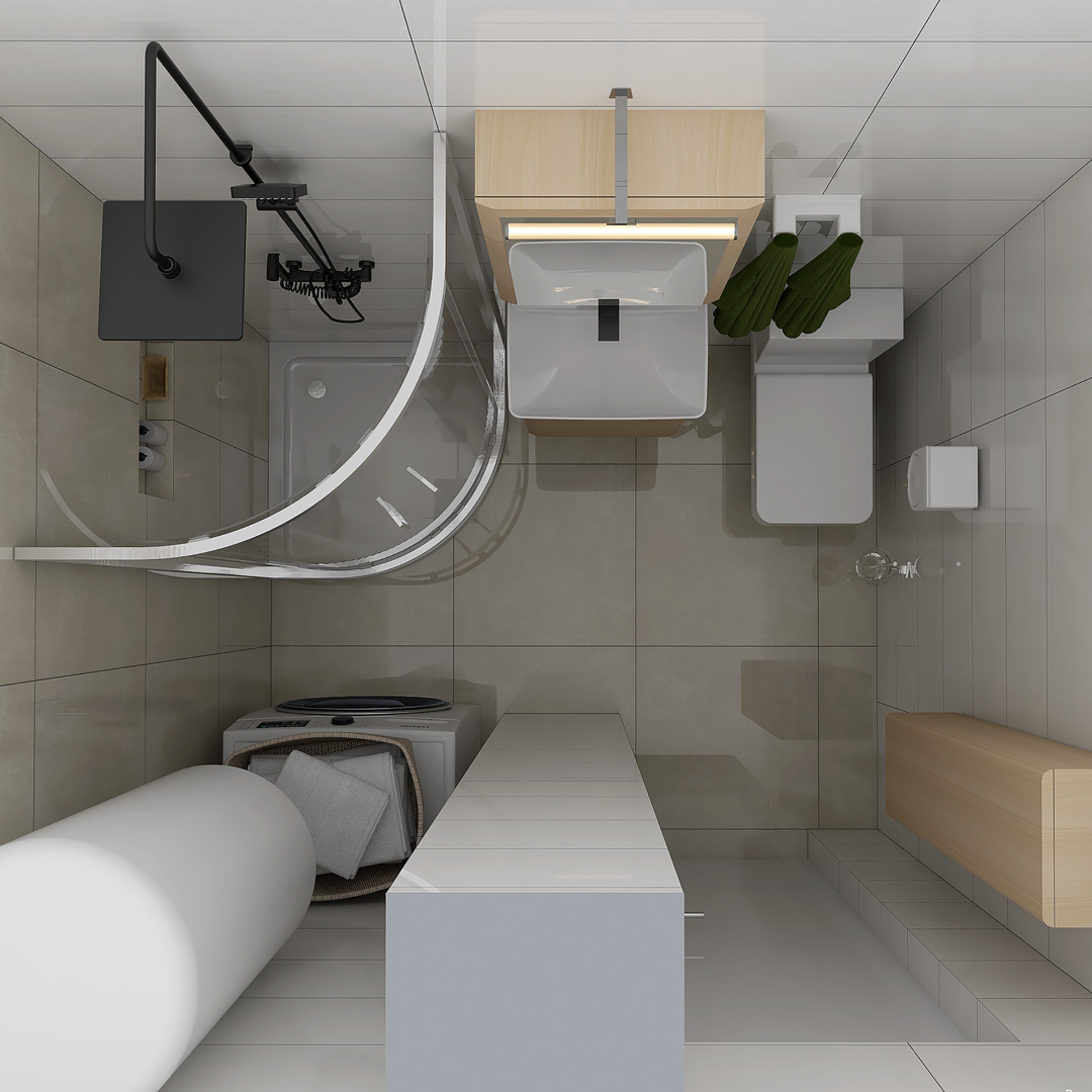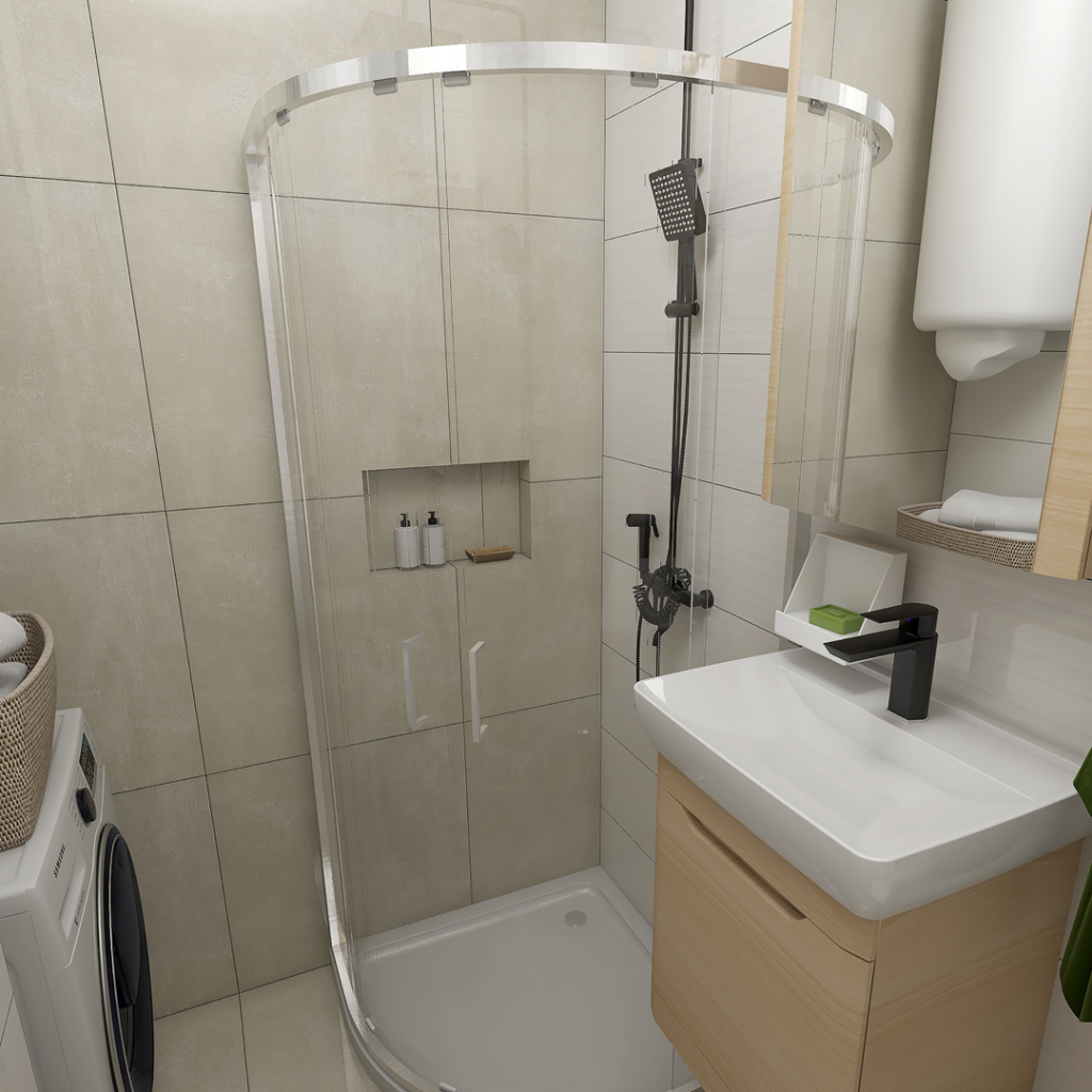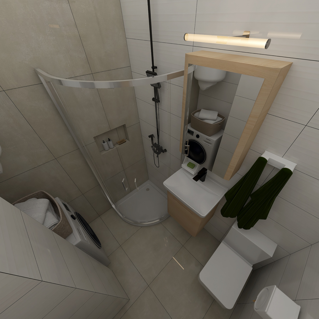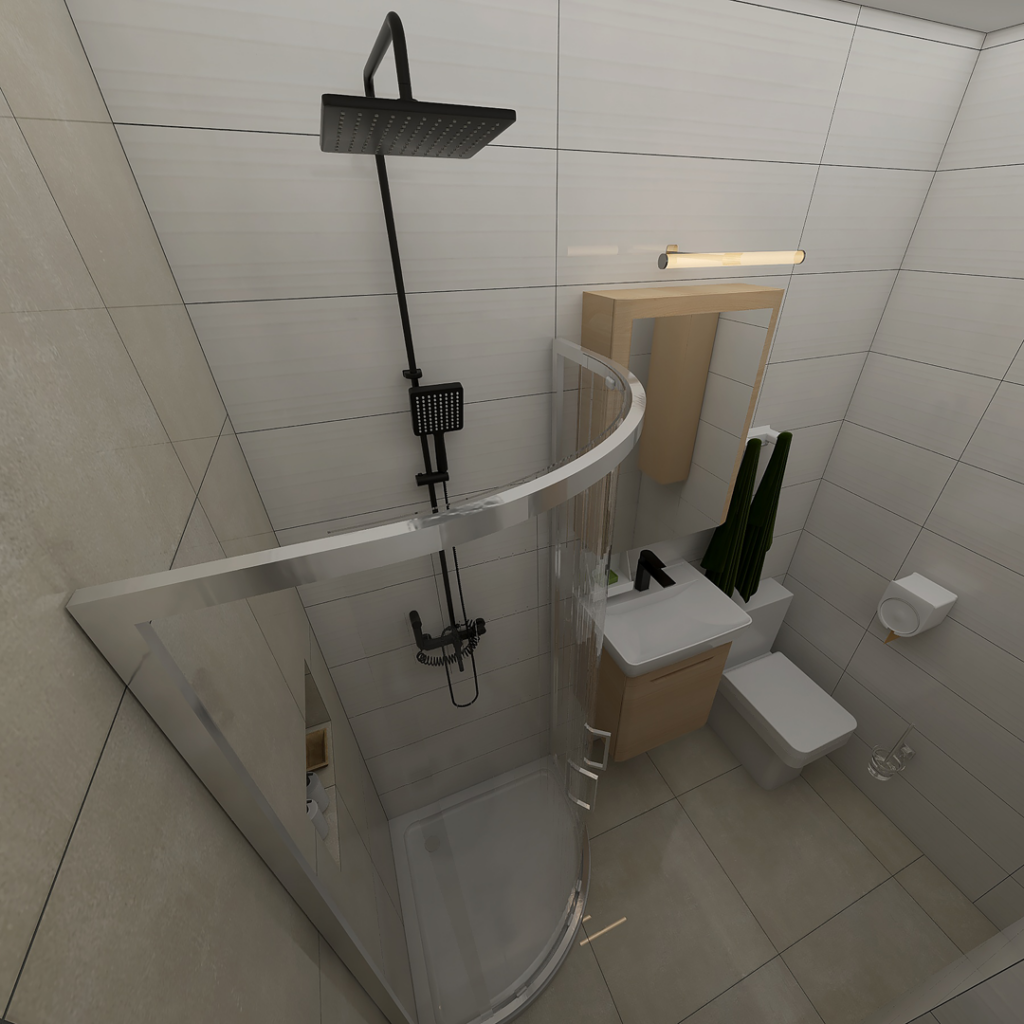 Prilikom izrade ovog projekta, odabrali smo pločice u sivim tonovima, italijanskog proizvođača Ragno. Na podu se nalaze kvadratne pločice iz serije Sound. Njihov naziv je Cream, dok se na zidovima nalaze pravougaone pločice Ragno Now Bianco Rigo 3D sa reljefnom površinom. Naša preporuka je da se prilikom lepljenja pločica koristi lepak Adesilex, koji pripada italijanskom brendu Mapei. Dok se za fugovanje preporučuje Keracolor FF, od istog proizvođača. Od kupatilskog nameštaja u ovom projektu, smo koristili proizvode iz serije Duru Soft, koji su u boji drveta. Ormarić je konzolni i dolazi u kompletu sa umivaonikom dok se iznad njega nalazi ogledalo sa LED lampom. Pored ulaznih vrata se nalazi vertikalni ormarić koji se takođe montira na zid. Sva 3 elementa iz ove serije nameštaja rađena su od medijapan ploča koje poseduju visok stepen otpornosti na vlagu. Od sanitarija, opredelili smo se za Moblok Noura sa istoimenom WC daskom. Ovaj monoblok je deo turskog brenda CeraStyle. U uglu se nalazi KolpaSanov tuš paravan Eco Quat sa ploukružnom kadicom Evelin, dok se unutra nalazi crni usponski tuš BGQ, koji dolazi u kompletu sa baterijom. Kupatiska galanterija u ovom kupatilu je od keramike, a njen naziv je Defne i proizvodi je CeraStyle.