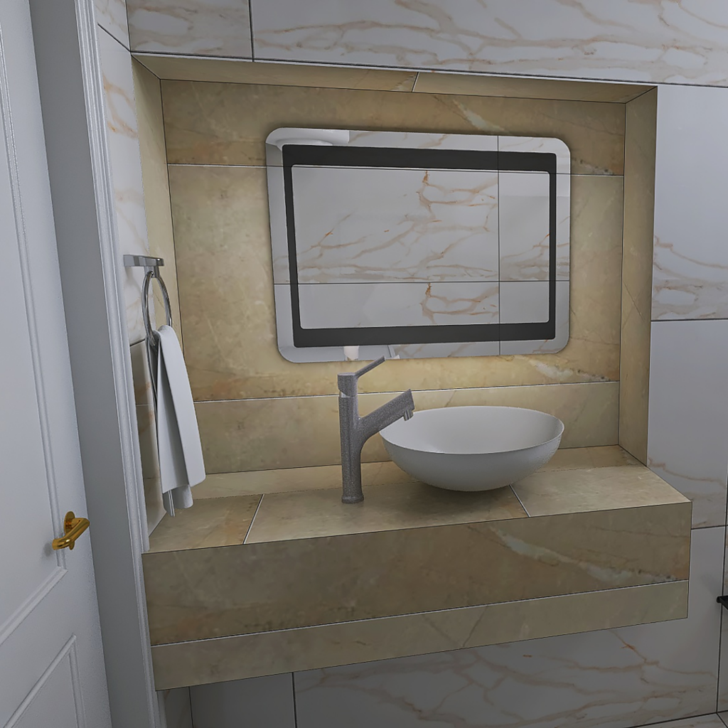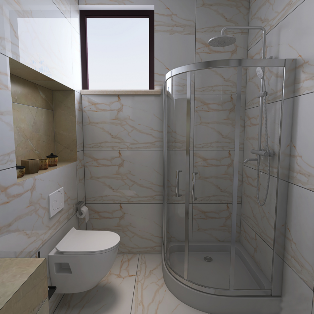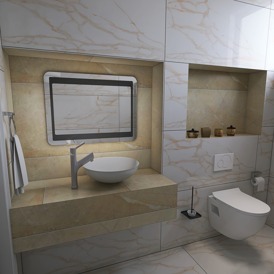 U ovom kupatilu dominira pločica Nepal Beige 60×120 i na podu i na zidu, struktura mermera. Detalji u nišama su predvidjeni od pločice Atlantis Beige 60×120 koja takodje ima strukturu mermera ali tamniju. Predvidjen je Turkuaz lavabo Zero, City konzolna šolja sa ugradnim vodokotlićem Nil takodje proizvođača Turkuaz. Česma i usponski tuš su renomiranog proizvođača Herc. Predviđen je vertikalni bojler Talas i led tač ogledalo iz ABR-ove ponude. Držač peškira, držač toalet papira i zidni držač četke su isto iz ponude sa našeg sajta: www.ceramica.co.rs
