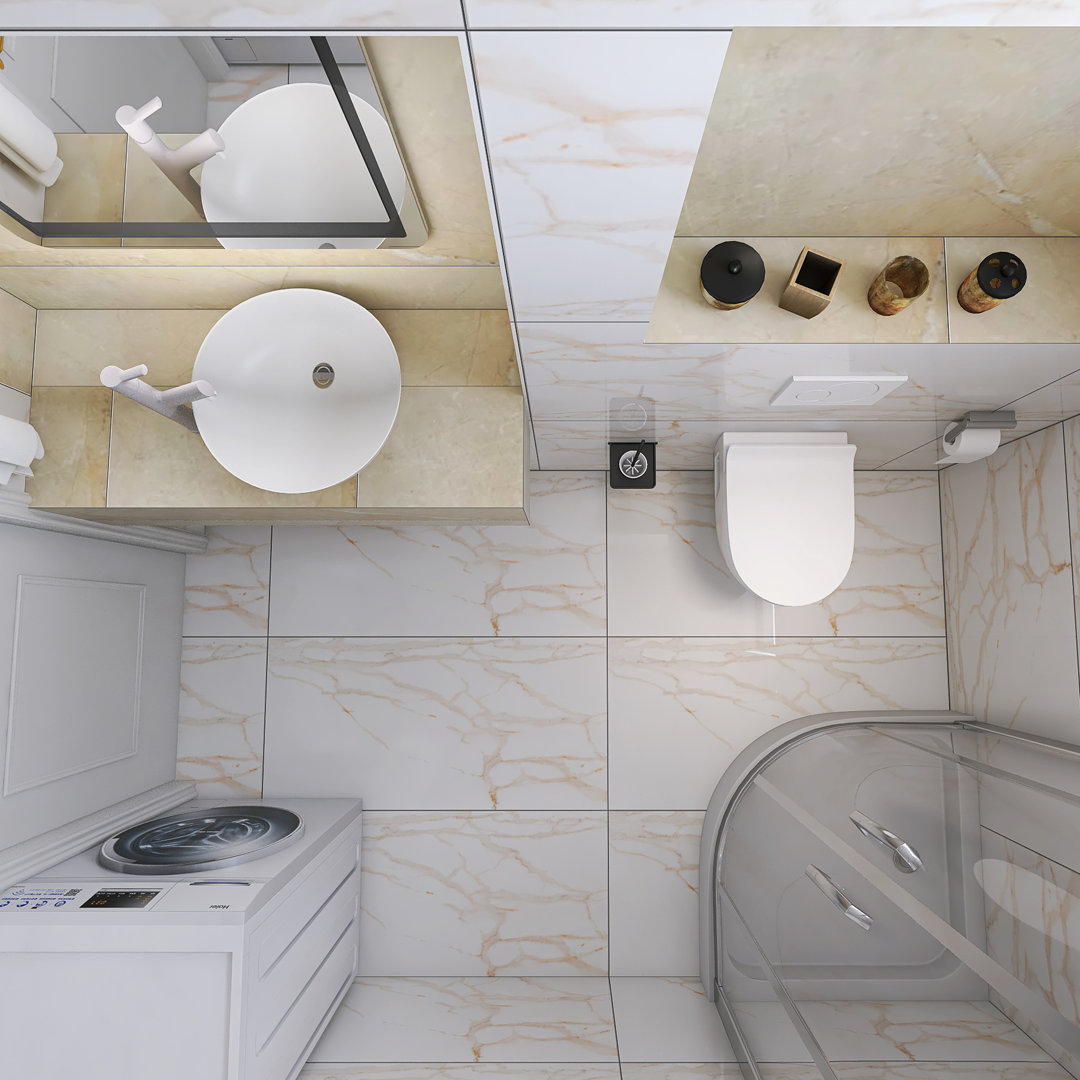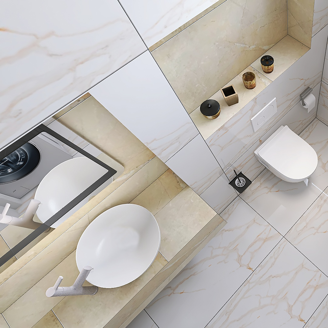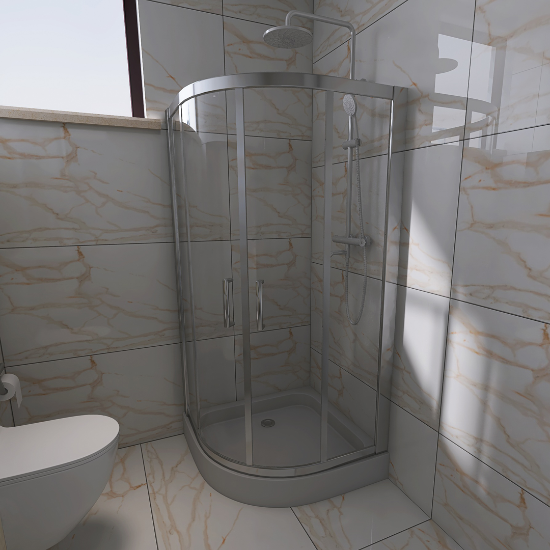 U ovom kupatilu dominira pločica Nepal Beige 60×120 i na podu i na zidu, struktura mermera. Detalji u nišama su predvidjeni od pločice Atlantis Beige 60×120 koja takodje ima strukturu mermera ali tamniju. Predvidjen je Turkuaz lavabo Zero, City konzolna šolja sa ugradnim vodokotlićem Nil takodje proizvođača Turkuaz. Česma i usponski tuš su renomiranog proizvođača Herc. Predviđen je vertikalni bojler Talas i led tač ogledalo iz ABR-ove ponude. Držač peškira, držač toalet papira i zidni držač četke su isto iz ponude sa našeg sajta: www.ceramica.co.rs