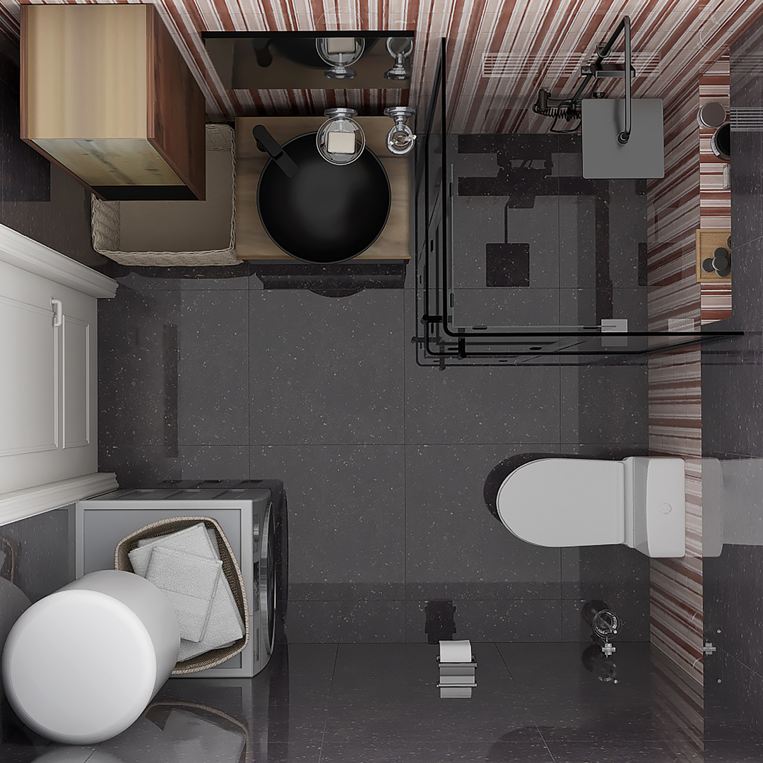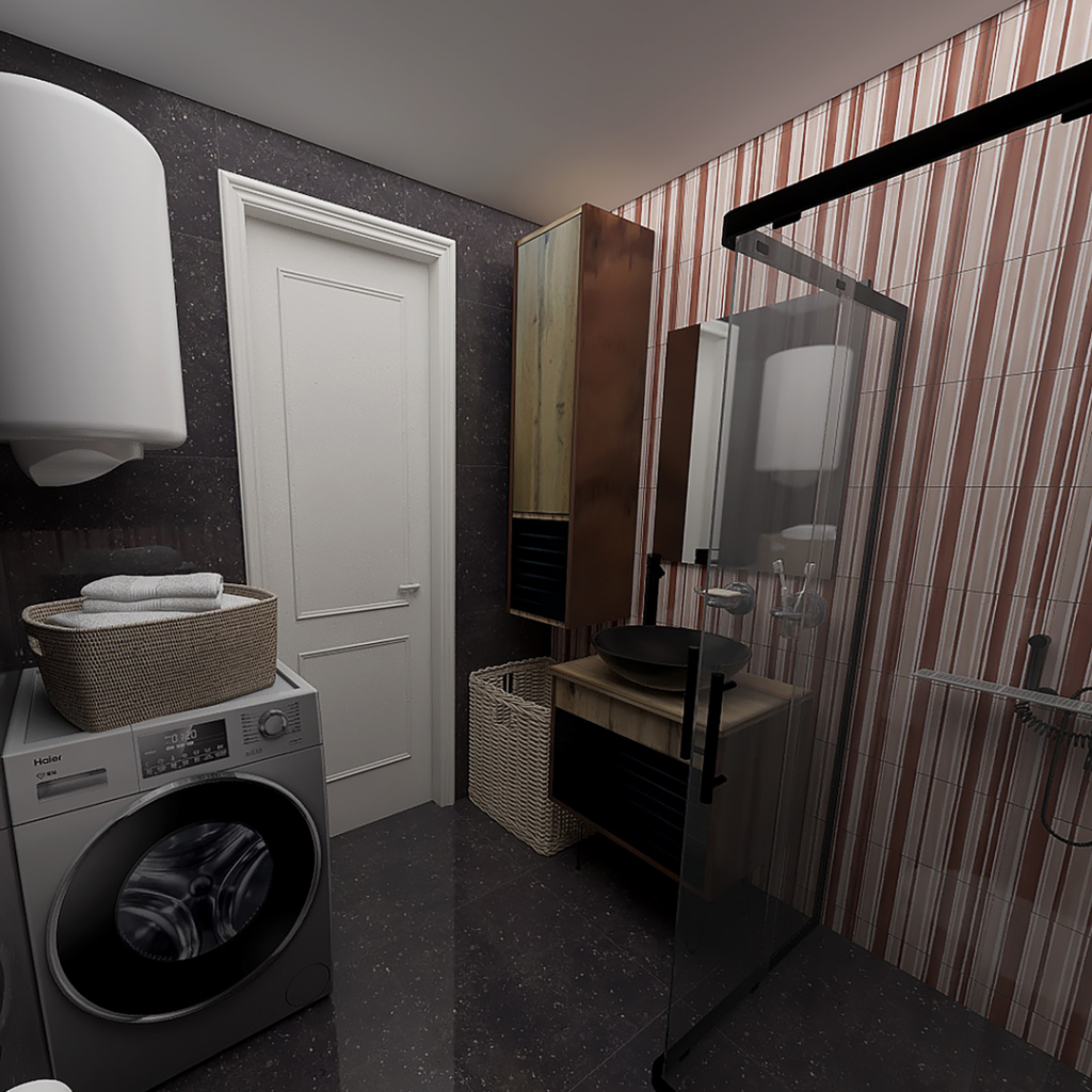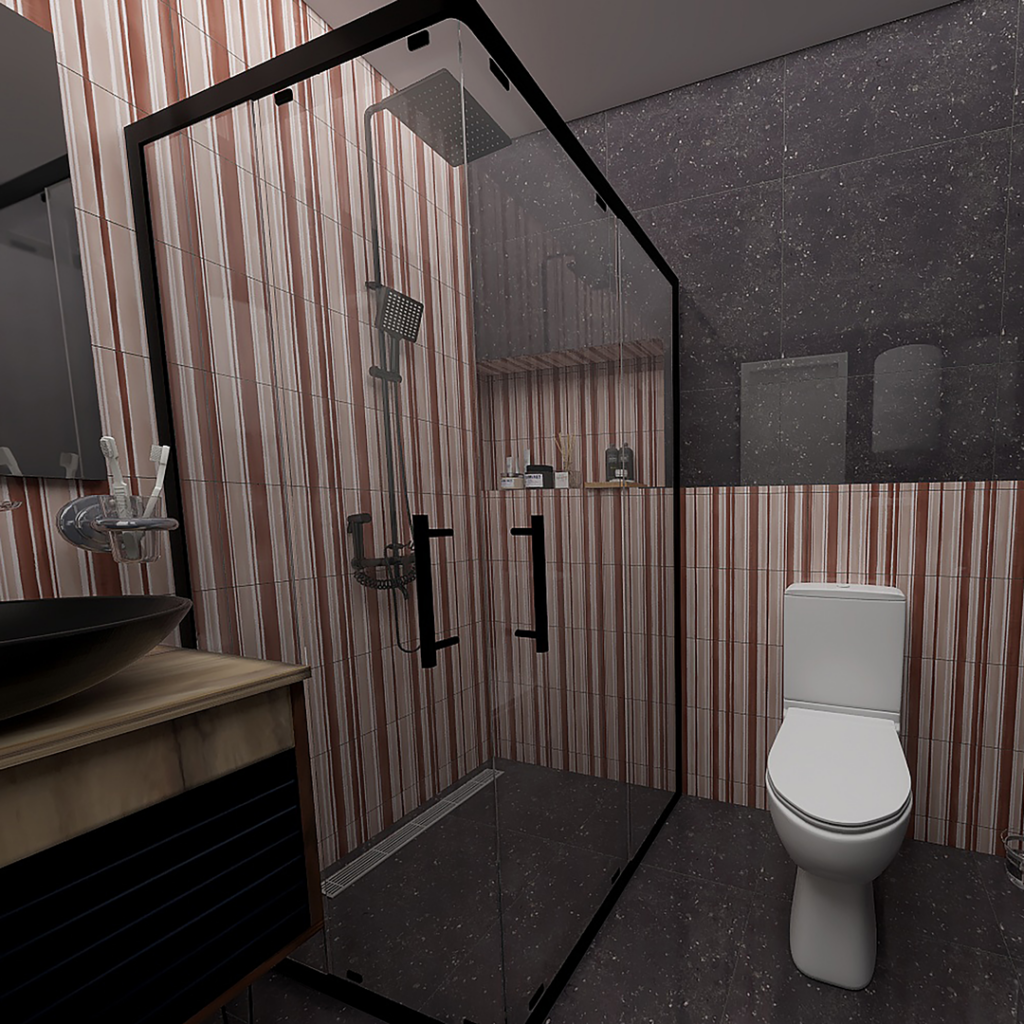 Prilikom izrade ovog 3D projekta, opredelili smo se za kombinaciju 2 vrste pločica Cartuja Negro i Decor Avorio Barre. Cartuja Negro se proizvodi u španiji i pripada brendu Keros, dok je pločica Decor Avorio Barre iz serije koja nosi naziv Now i proizvodi se u italiji. Ormarić nosi naziv Taylan i na njemu je crni-okrugli umivaonik zero 46. Ovaj ormarić je u dezenu drveta sa crnim metalnim nogicama i crnim detaljima na fioci. Proizvodi Kubis iz Mladenovca. Iznad njega nalazi se ogledalo Bella Dona 70k, a pored je vertikala Taylan od istog proizvođača. Umesto šolje i vodokotlića smo se opredelili za monoblok Bella sa odgovarajućom WC daskom koji proizvodi turski brend Cerastyle. U uglu se nalazi Eco Quat TKK, tuš paravan sa crnim okvirom, koji proizvodi Kolpa iz Slovenije. Unutra se nalazi usponski tuš King sa baterijom, dok je za odvod vode postavljen linearni slivnik sa prohromskom rešetkom, koji proizvodi Alca Plast. Kupatilska galanterija u ovom 3D projektu je iz ponude sa sajta ABR. Kod ovog kupatila preporučili smo lepkove italijanskog proizvođača Mapei.