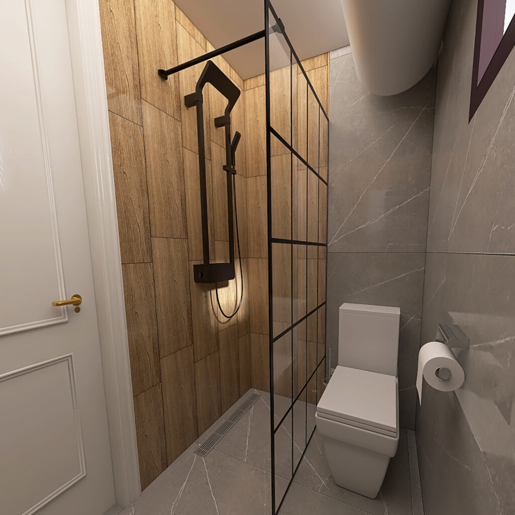 Kupatilo iz ovog 3D projekta je izuzetno malih dimenzija, pa smo bili prinudjeni da biramo elemente manjih dimenzija kako bi što efikasnije iskoristili prostor. Što se tiče pločica kombinovali smo dve vrste pločica. Jedne su u stilu sivog mermera – Tactile Grey, a druge su u stilu drveta – Ebano Natural. Ove dve vrste pločica pripadaju Španskom brendu STN. Što se tiče odabira lepka i fuga za pločice, prepručujemo lepkove i fuge Italijanskog proizvođača Mapei. U delu za tuširanje nalazi se crni usponski tuš BGQ, ispod se nalazi alka plastov linearni slivnik sa prohromskom rešetkom, dok smo umesto tuš kabine, stavili fiksnu staklenu pregradu sa crnim okvirom – takozvanu tuš stenu, širine 80cm. Pored se nalazi turkuazov monoblok Mona MB, dok se preko puta nalazi ormarić sa umivaonikom i ogledalo iz serije nameštaja Trend DB 55, koje pripada našem brendu ABR. Baterija za umivaonik Aroha je u crnoj boji i proizvodi se u Španiji. Kako bi dodatno uštedeli na prostoru, postavljen je horizontalni bojler umesto vertikalnog. Držač peškira, držač wc četke, držač rolo papira kao i ostala kupatilska galanterija je iz našeg online Web Shop-a.
