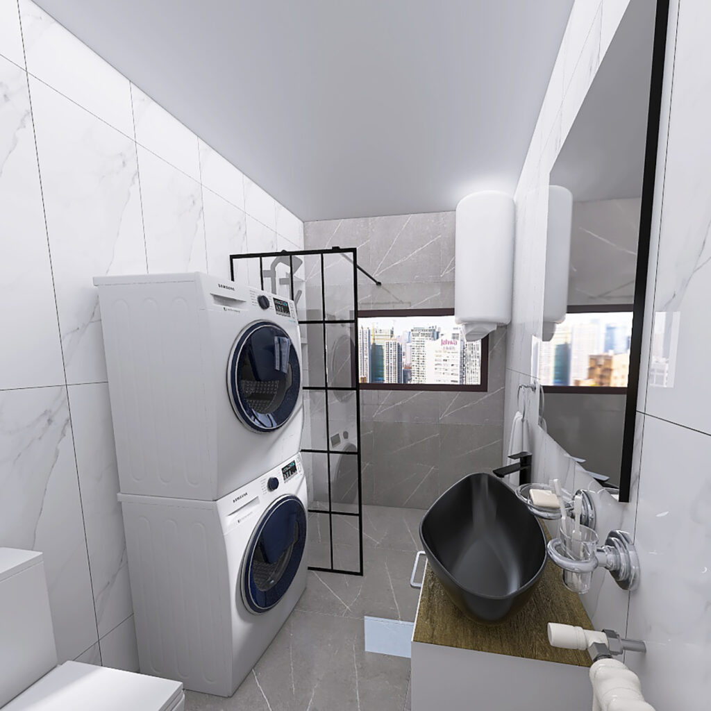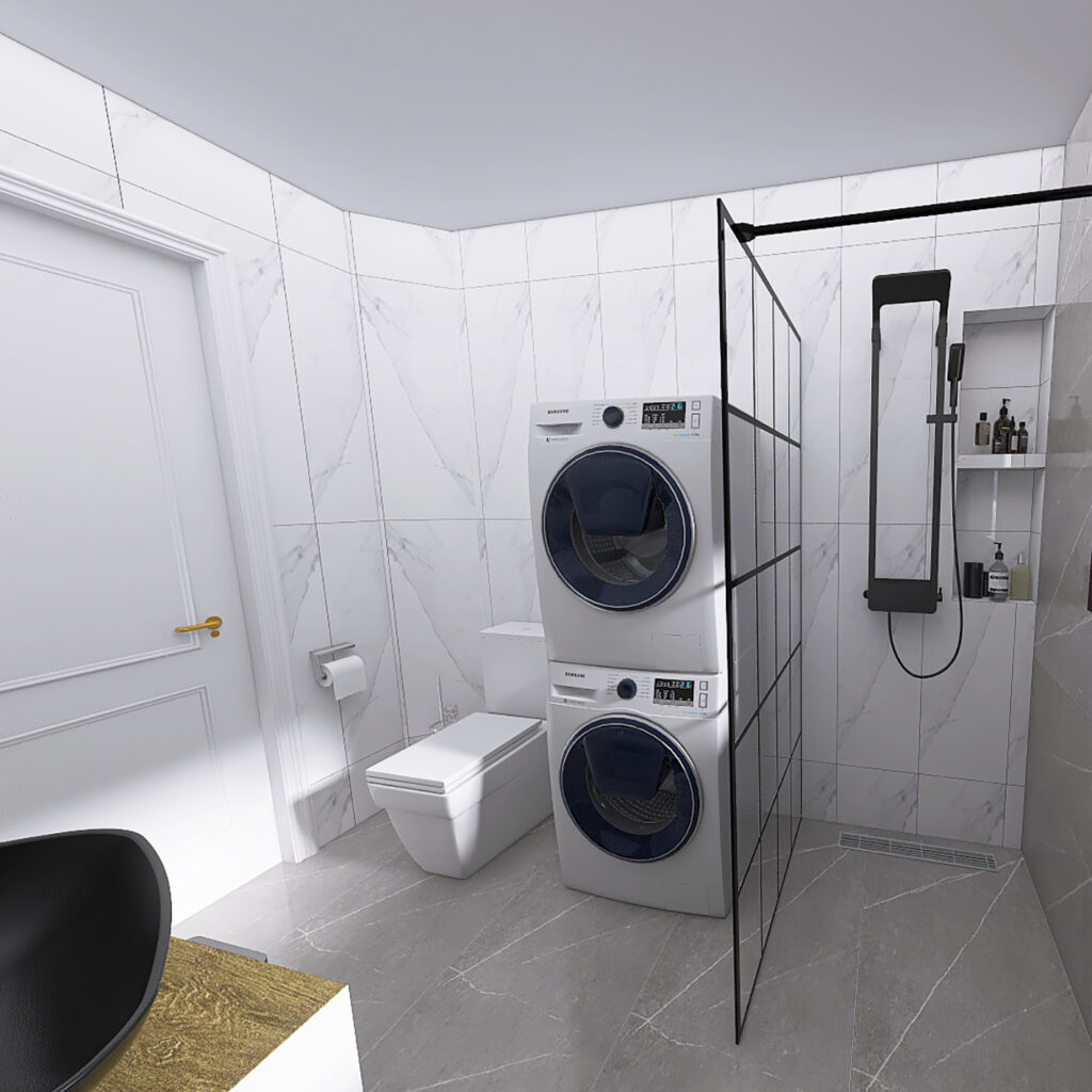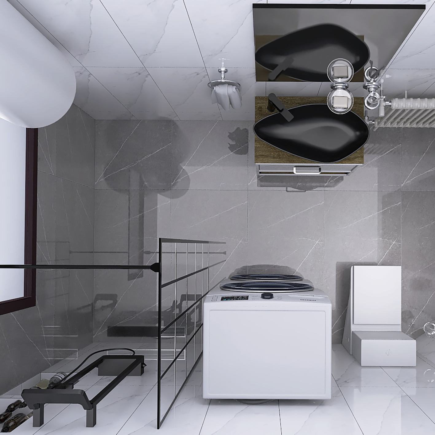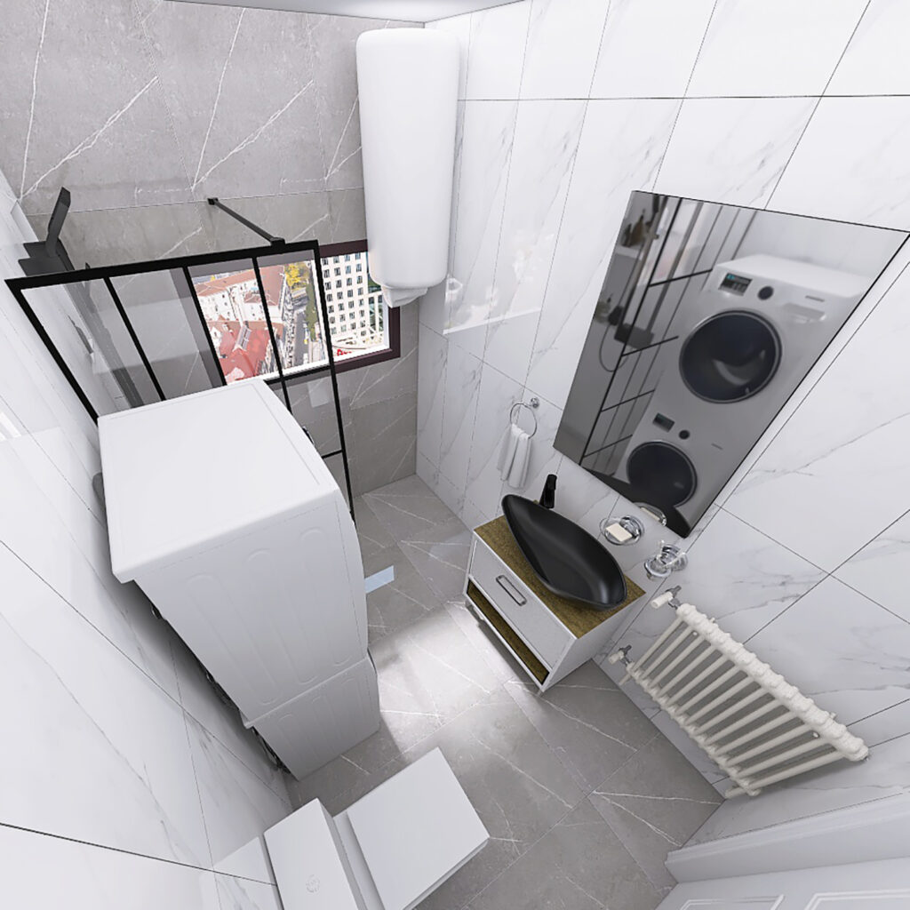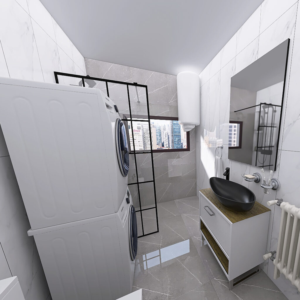 U ovom 3D projektu kupatila primenjene su pločice u sivim i belim tonovima u kombinaciji sa modernim kupatilskim nameštajem i sanitarijama. Primenom crnih slavina prostoru se dodaje doza luksuza. Nazivi ovih pločica su Tactile Grey i Duomo Blanco i obadva modela se proizvode u Španiji i pripadaju brendu STN Ceramica. U uglu ovog 3D projekta nalazi se Monoblok Noura MB. Na suprotnoj strani kupatila postavili smo Ormarić i ogledalo iz Kubisove serije nameštaja Bella Dona 70, dok je umivaonik Olive 74 u crnoj boji i proizvodi ga Turkuaz. Baterija za umivaonik Elite i Usponski tuš BGQ su takođe u crnoj boji. U drugom uglu ovog kupatila, nalazi se fiksna staklena pregrada – tuš stena, sa okvirom u crnoj boji, dok je za odvod vode postavljena Alka plastova tuš kanalica sa prohromskom rešetkom. Kupatilska galanterija iz ovog 3D projekta, nalazi se u ponudi na sajtu keramike ABR.