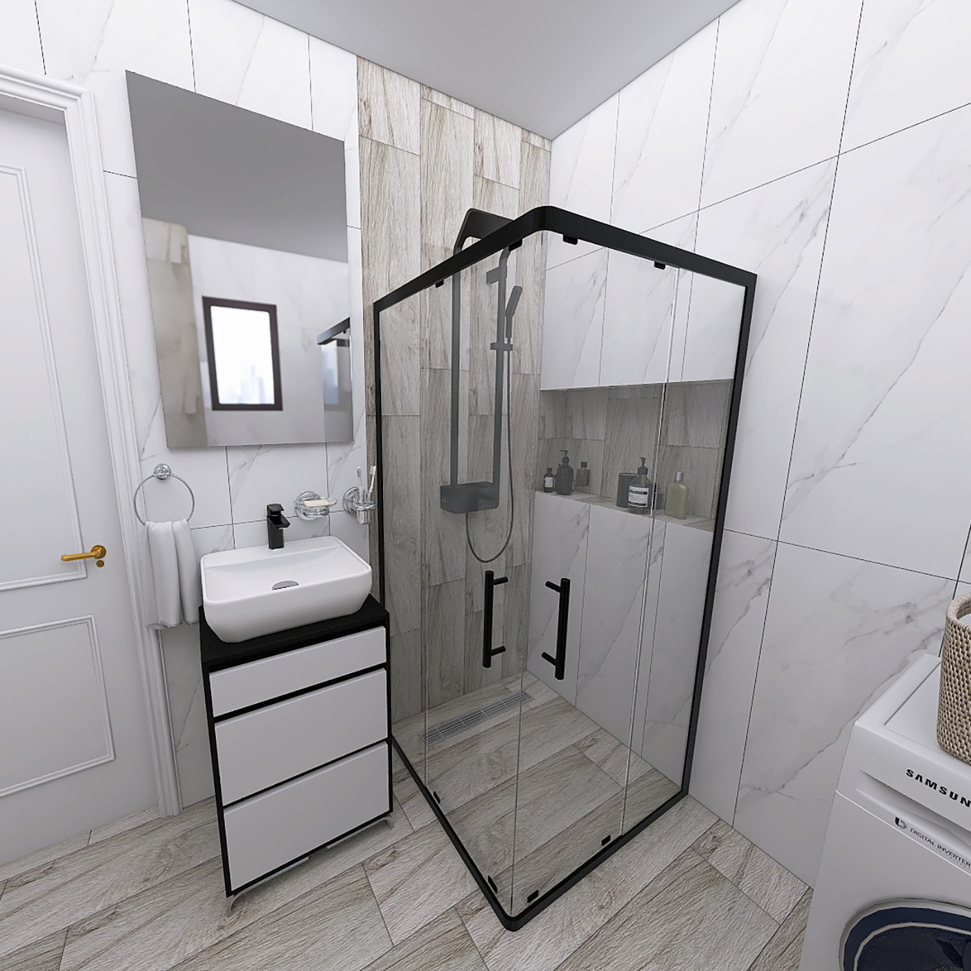 Renoviranje kupatila kobinovanjem mermera i drveta sa detaljima u crnoj boji – Kupatilski nameštaj Hilton K