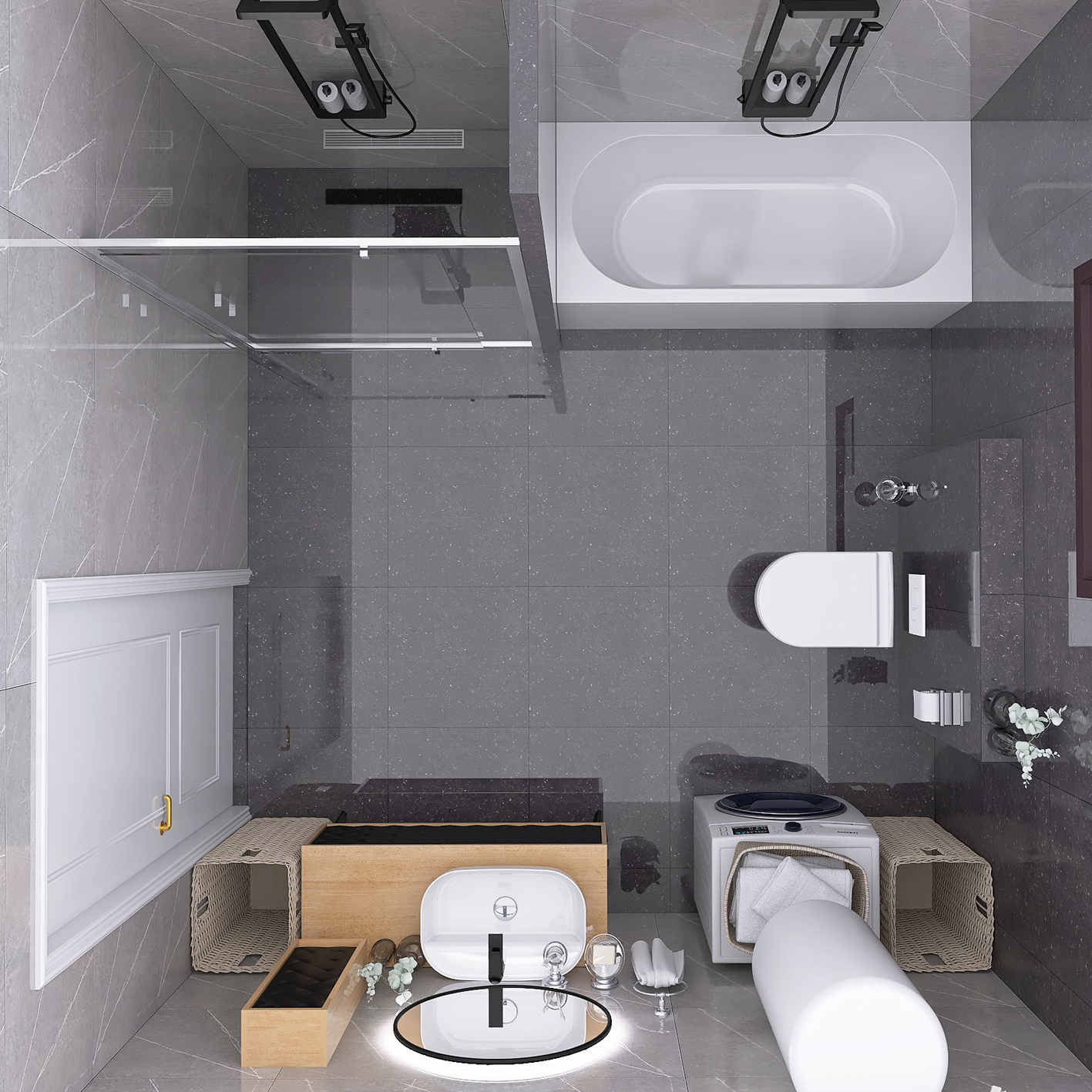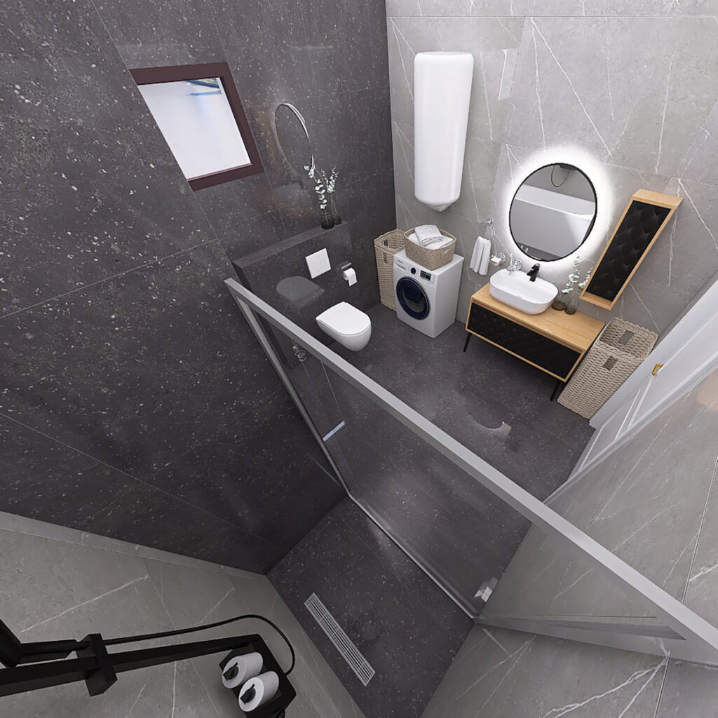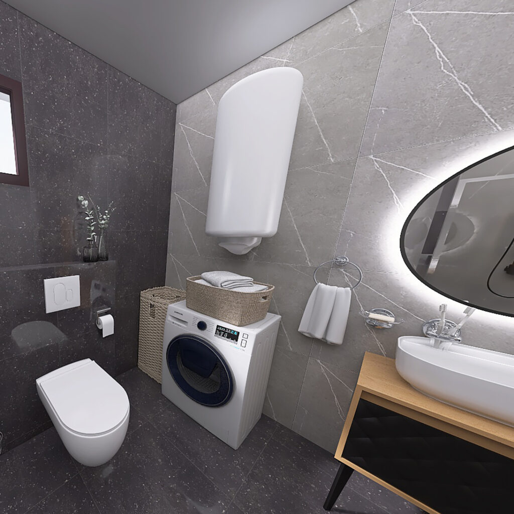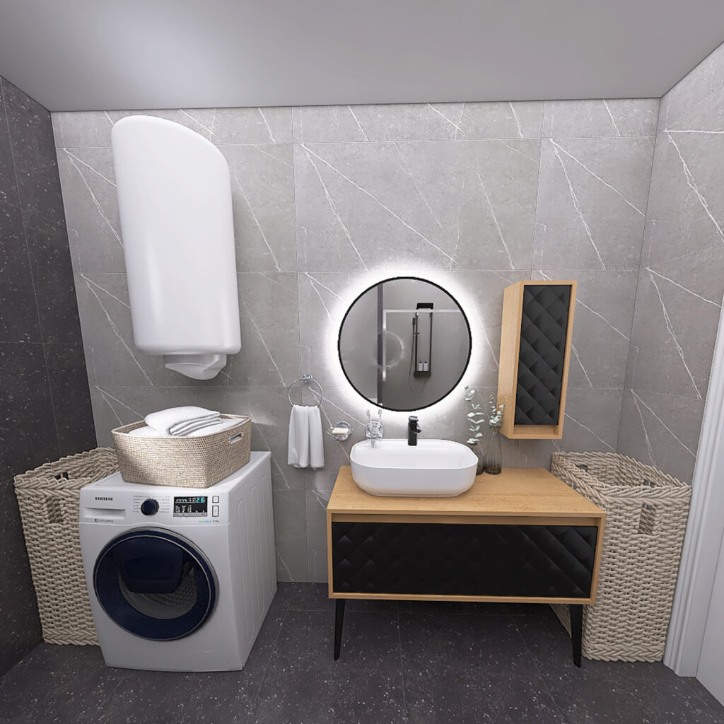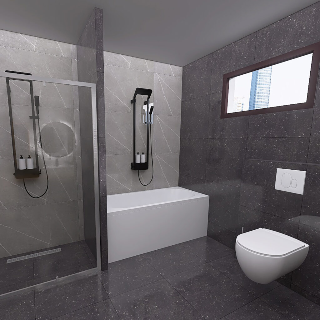 Kao ideju za renoviranje Vašeg kupatila, predstavljamo Vam 3D projekat kupatila u kome su kombinovane pločice u sivim i crnim tonovima. Pored ovih pločica, opredelili smo se za moderan kupatilski nameštaj i sanitarije, koje ovom prostoru daju dozu luksuza. Nazivi pločica iz ovog kupatila su Cartuja Negro i Tactile Grey i pripadaju brendovima Keros, odnosno STN Ceramica. Obadva modela pločica se proizvode u Španiji. Po želji kupca postavljena je akrilna kada Tamia, dok je pored nje pregradjen deo za tuširanje, u kome su postavljena tuš vrata od 120cm. Iznad kade, kao i u delu za tuširanje postavljen je crni usponski tuš BGQ, koji dolazi u kompletu sa ručnim tušem i baterijom. U delu za tuširanje smo postavili i jedan alka plastov tuš slivnik sa prohromskom rešetkom. Na drugoj strani kupatila nalazi se nameštaj našeg brenda ABR, koji je pravljen od visoko-kvalitetnih MDF ploča, sa visokim stepenom otpronosti na vlagu. Ova serija nameštaja nosi naziv Monart DB i u njoj se nalaze ormarić sa umivaonikom Aqua, konzolna vertikala kao i okruglo ogledalo sa LED svetlom. Za umivaonik smo odabrali bateriju Aroha, koja je u crnoj boji i savršeno se uklapa u koncept ovog 3D projekta. Na zidu pored kade smo se opredelili za jednu konzolnu šolju City Rimless sa ugradnim vodokotlićem Nil i WC daskom Bella slim sa sistemom za sporo spuštanje. Od ostalih elemenata koje smo koristili tu je jedan vertikalni bojler od 80 litara i kupatilska galanterija iz naše onlajn ponude. Preporučeni lepokovi i fuge za ovo kupatilo pripadaju Italijanskom brendu Mapei.
