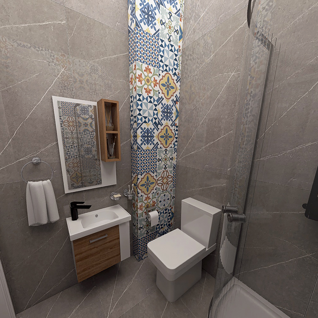 Kombinacija sivih i šarenih pločica za moderno kupatilo – Step DB kupatilski nameštaj