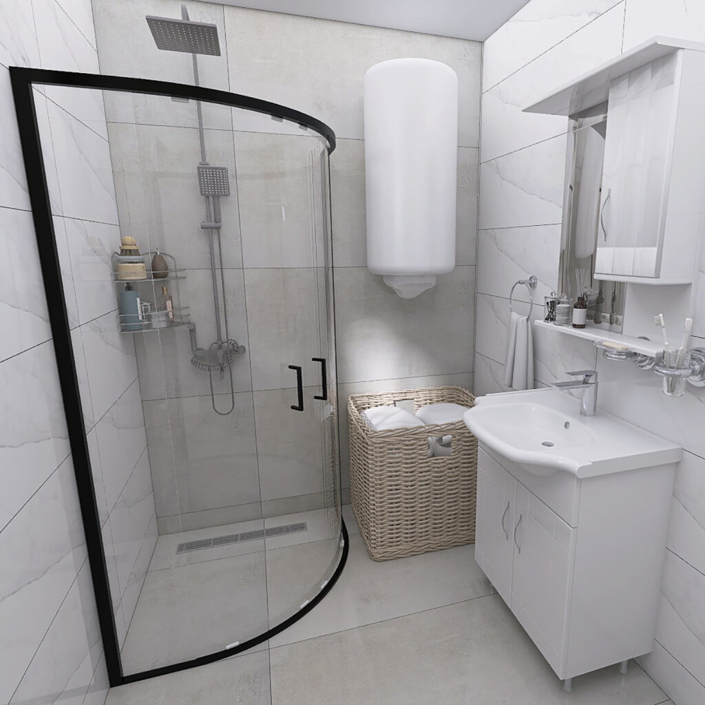 Što se tiče sanitarija koje smo koristili za uredjenje ovog kupatila, opredelili smo se za turski brend Cerastyle. Ugradni vodokotlić Nil, sa konzolnom WC šoljom i daskom iz serije City. Ovaj brend proizvodi i umivaonik New Classic 65. Ormarić dolazi u kompletu sa umivaonikom i njegov naziv je Deniz 65 DB. Iznad njega se nalazi Ogledalo Deniz 65 DB i oba ova elementa pripadaju našem brendu kupatilskog nameštaja Bellezza. Tuš kabinu Eco Quat TKP, proizvodi KolpaSan iz Slovenije. Unutra se nalazi usponski tuš sa baterijom King, dok smo za odvod vode postavili linearni slivnik sa prohromskom rešetkom koju proizvodi Alca Plast.