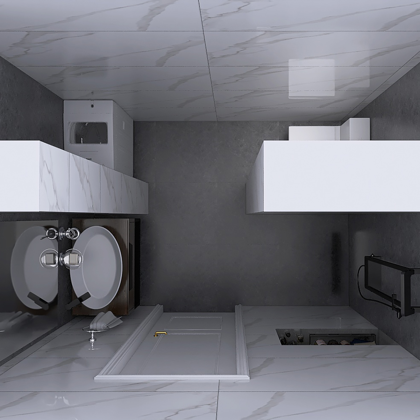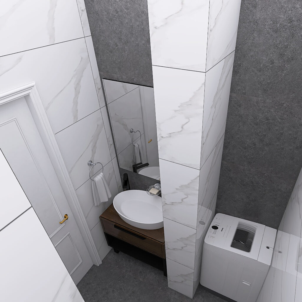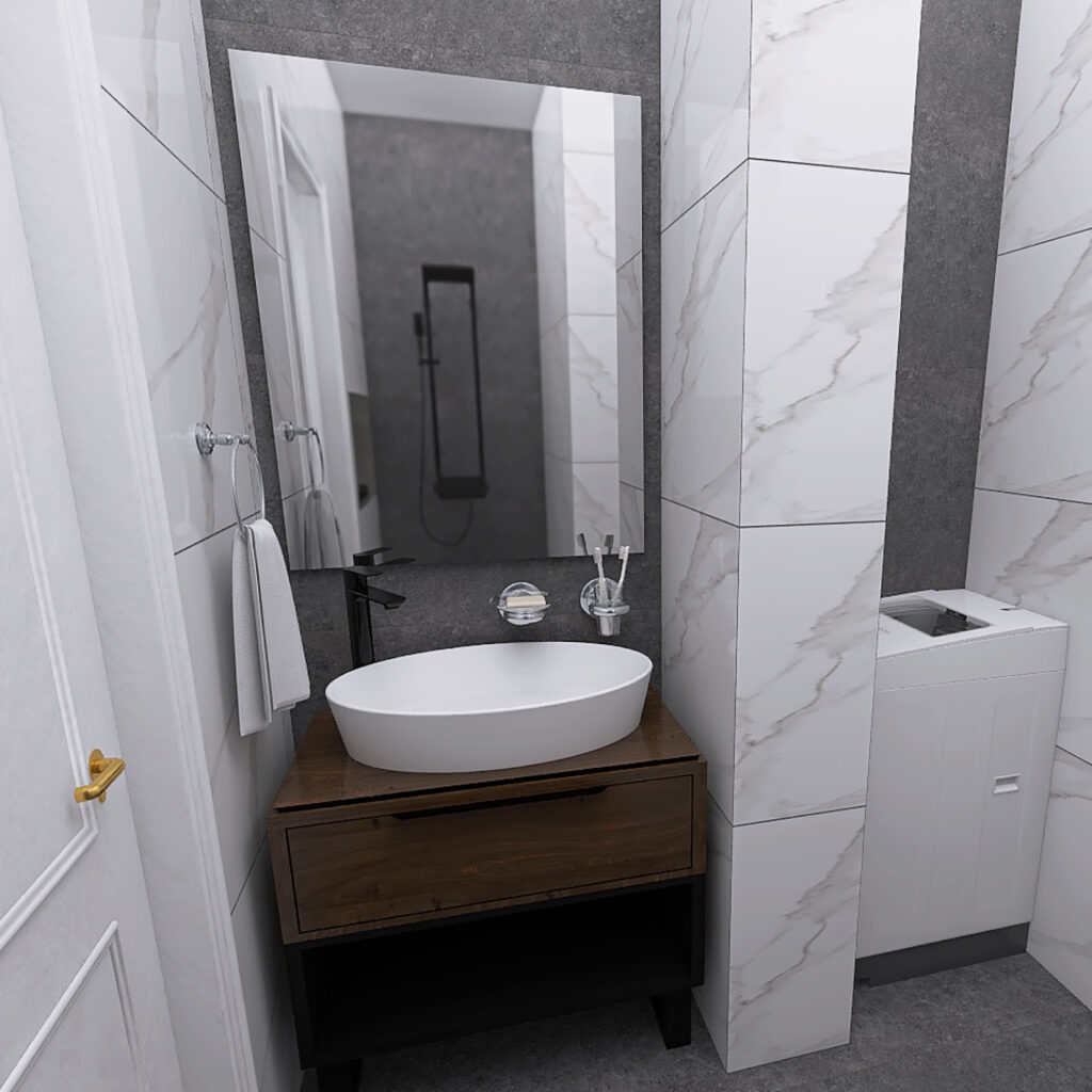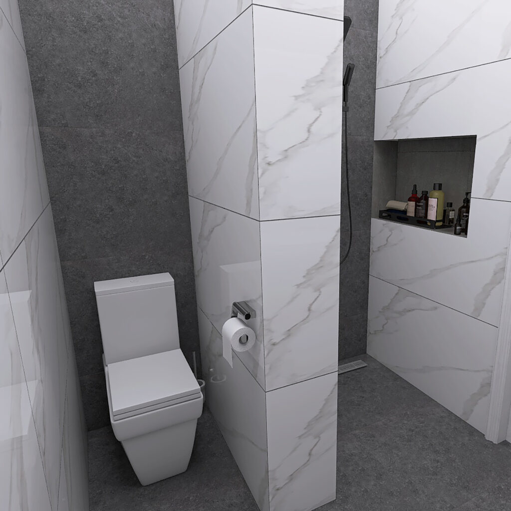 3D projekat koji Vam danas predstavljamo, je rađen sa pločicama koje predstavljaju imitaciju mermera. Za ovaj projekat smo koristili pločice u belim i tamno antracit-crnim tonovima. Nazivi ovih pločica su Duomo Blanco, EcoProject Smoke. Ova dva modela pločica proizvode se u španiji, odnosno italiji i pripadaju brendovim STN i Sintesi. Naša preporuka je da se prilikom oblaganja podova i zidova keramikom kao spojno sredstvo koristi lepak Adesilex P7 Extra, dok se kod fugovanja preporučuje korišćenje fug mase Keracolor FF. Fug masa i lepak, iz naše preporuke, pripadaju italijanskom proizvođaču Mapei. Po želji našeg kllijenta, postavljena je jedna fiksna pregrada u delu za tuširanje, i postavljena je tako da preostali prostor u kupatilu ostane funkcionalan. Unutar dela za tuširanje, nalazi se crni usponski tuš sa baterijom, a za odvod vode je predviđen linearni slivnik sa prohromskom rešetkom, koji proizvodi Alca plast. Sva galanterija, je iz naše onlajn prodavnice. Umesto klasične WC šolje, opredelili smo se za monoblok Mona MB sa istoimenom WC daskom. Ova dva proizvoda pripadaju turskom brendu CeraStyle. Ovom brendu pripada i umivaonik One 67cm. Ispod umivaonika nalazi se ormarić Bella Dona K, dok se iznad umivaonika nalazi ogledalo iz iste serije. Ovu seriju kupatilskog nameštaja proizvodi Kubis iz Mladenovca. Baterija za umivaonik je iz serije koja nosi naziv S2 Black, a proizvodi je domaći brend Rosan.