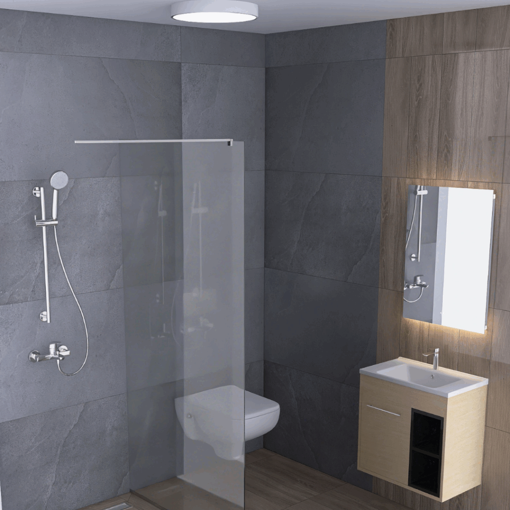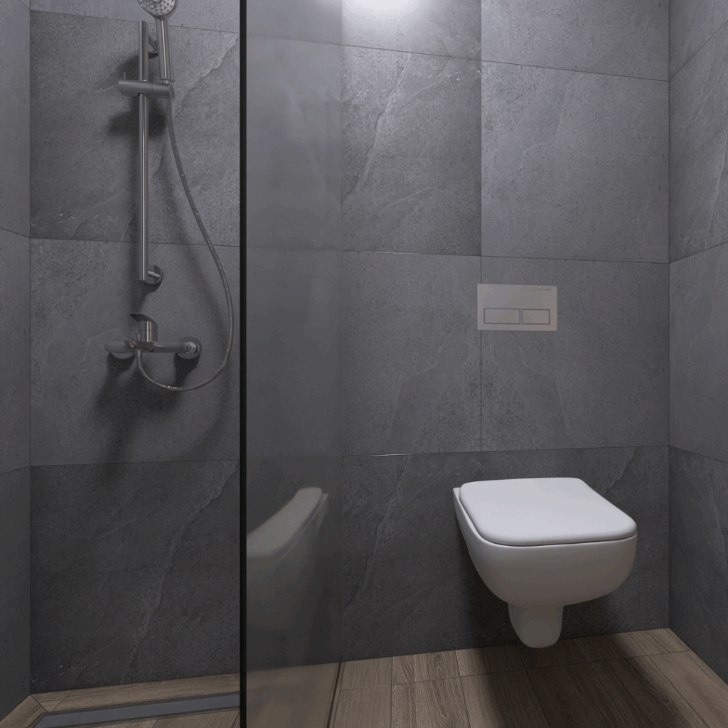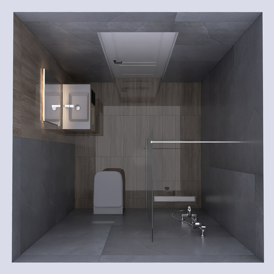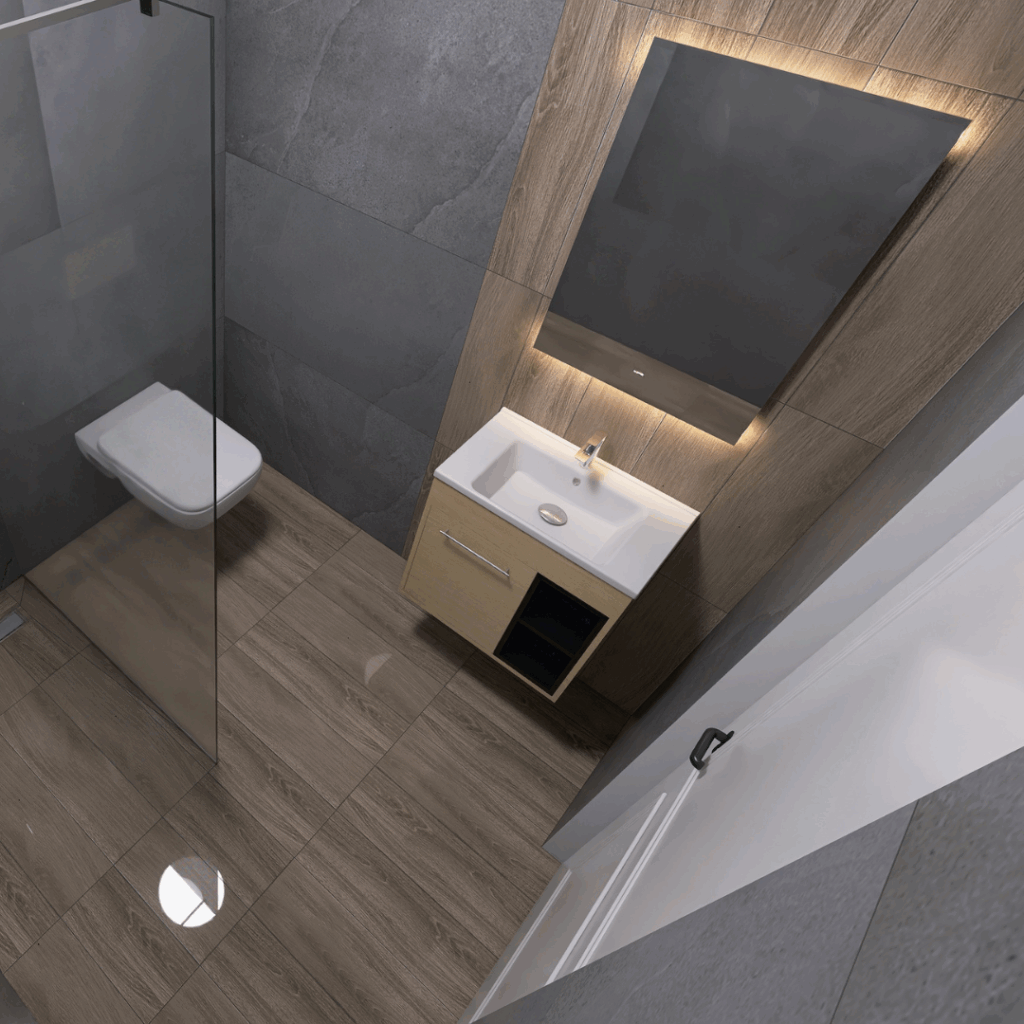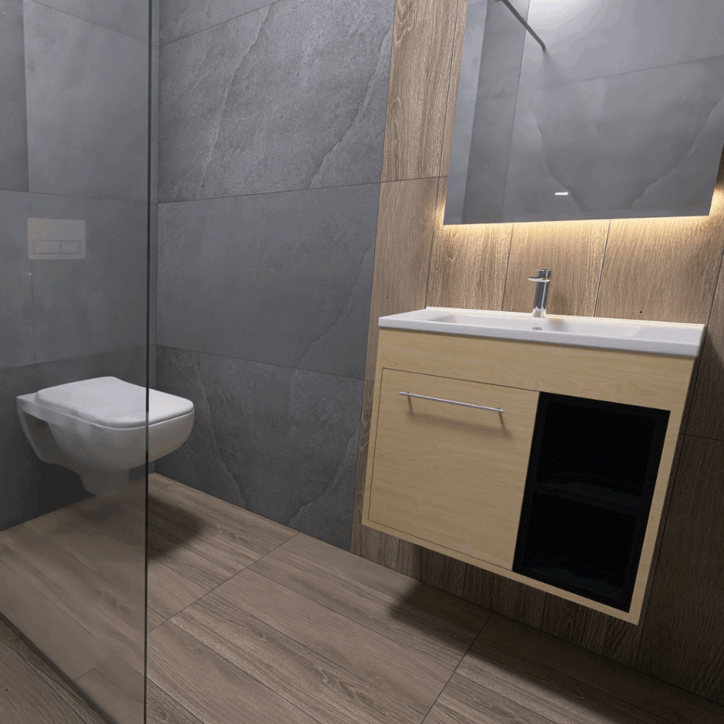 Kupatilo iz ovog 3D projekta renovirano je kombinacijom pločica koje donose toplinu prirodnog drveta i efekat sivog kamena. Drveni efekat postignut je pločicama G 1800 Beige, dok je prirodni izgled kamena dobijen modelom Fusion Dark Grey. Obe kolekcije dolaze iz Evrope (Italija i Poljska) i nose potpis renomiranog brenda Cersanit, odnosno Granito Forte.
