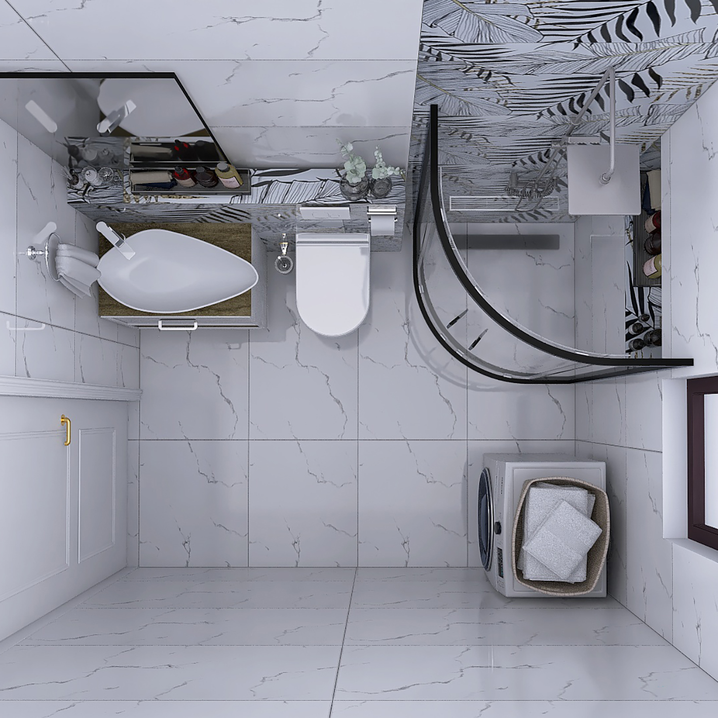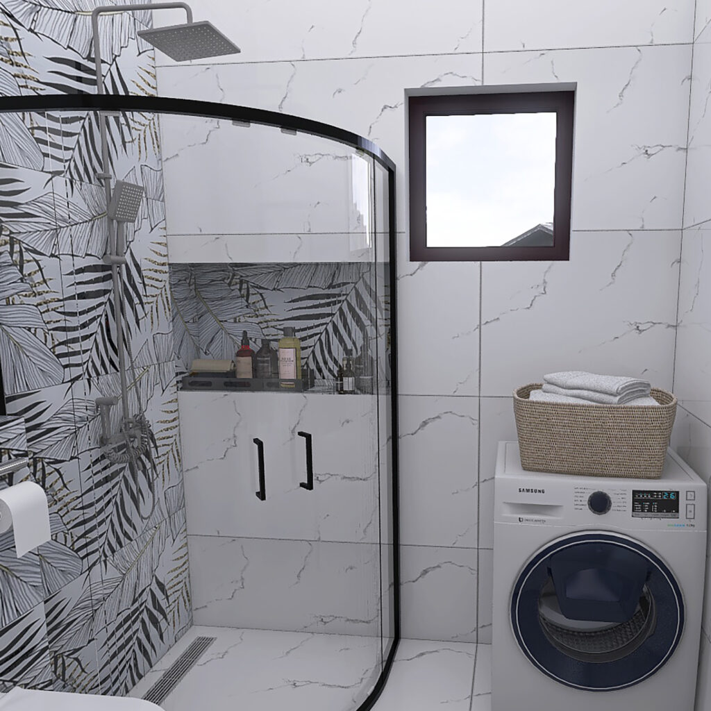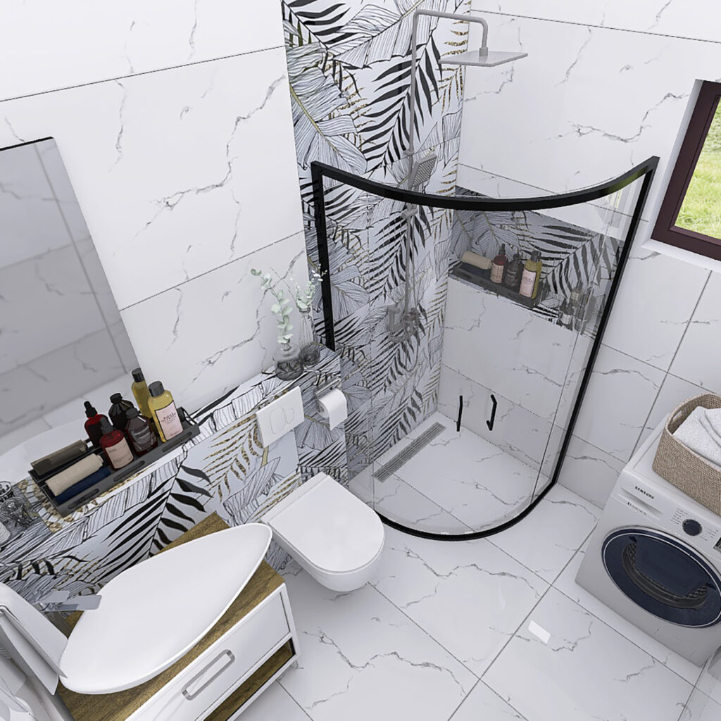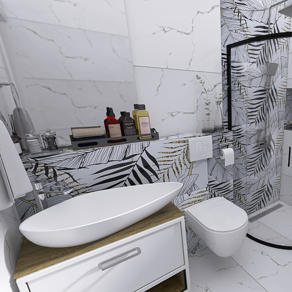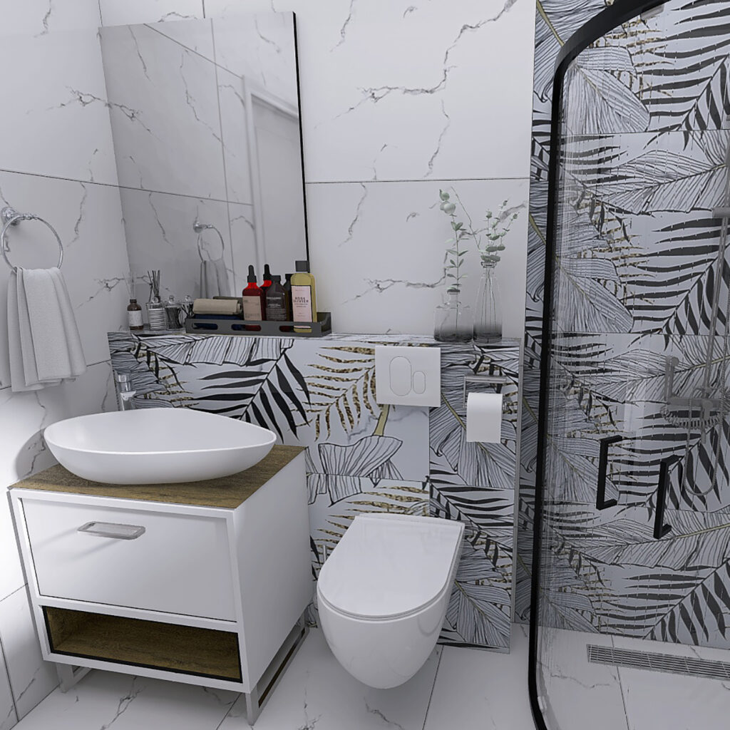 U ovom enterijerskom rešenju kupatila, spojili smo savremeni dizajn i upečatljive dekorativne elemente kako bismo postigli sklad između funkcionalnosti i estetike, čak i u manjem prostoru. Dominantna bela keramika sa diskretnim mermernim šarama (Carrara Grey) otvara prostor, dok dekor pločice sa motivima lišća (Carrara Grey Decor) unose dinamiku i stvaraju luksuznu atmosferu.