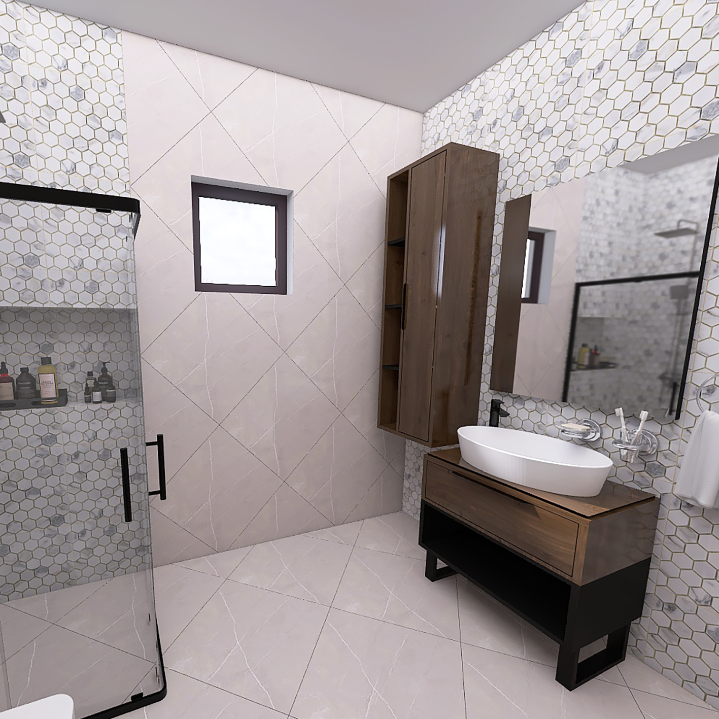 Topli tonovi i geometrijski kontrast u modernom kupatilu – Nameštaj Bella Dona Plus 80k