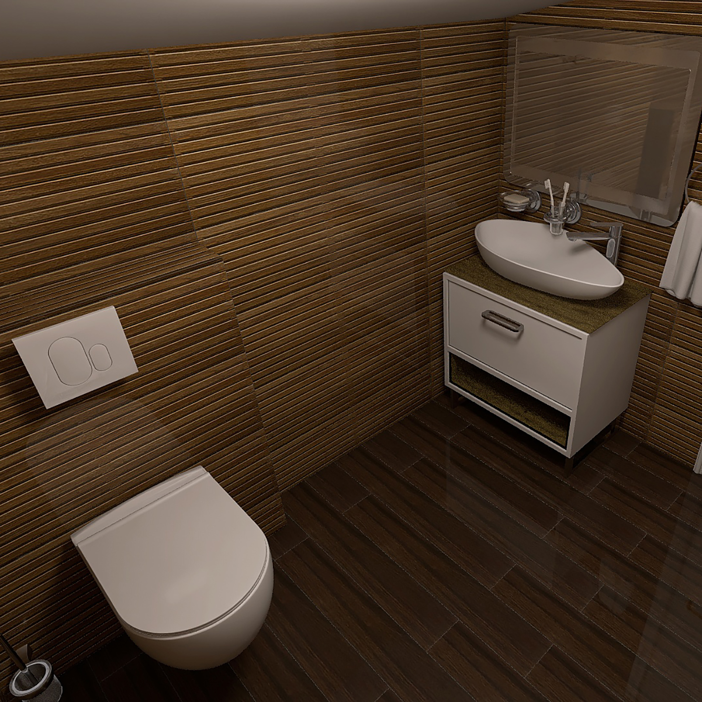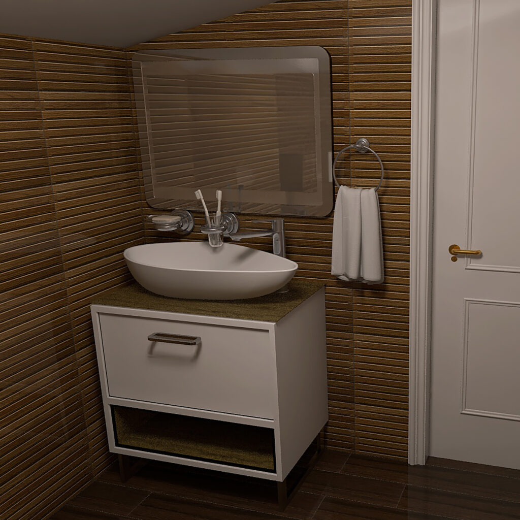 Kupatilski nameštaj i sanitarija – konzolna šolja, ormarić Bella Dona, lavabo Olive i LED ogledalo – pažljivo su uklopljeni u dizajn, a kvalitetna hidroizolacija i odabrani lepak Mapei sistema garantuju dugotrajnost.