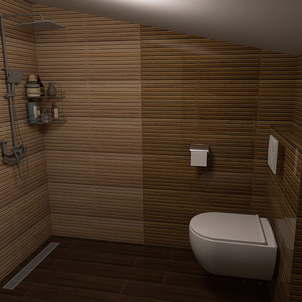 Kosina plafona je uspešno integrisana u enterijer, a prostor za tuširanje opremljen je modernom kanalicom, brenda Alca plast i usponskim tušem koji dolazi u kompletu sa baterijom, domaćeg brenda Rosan.