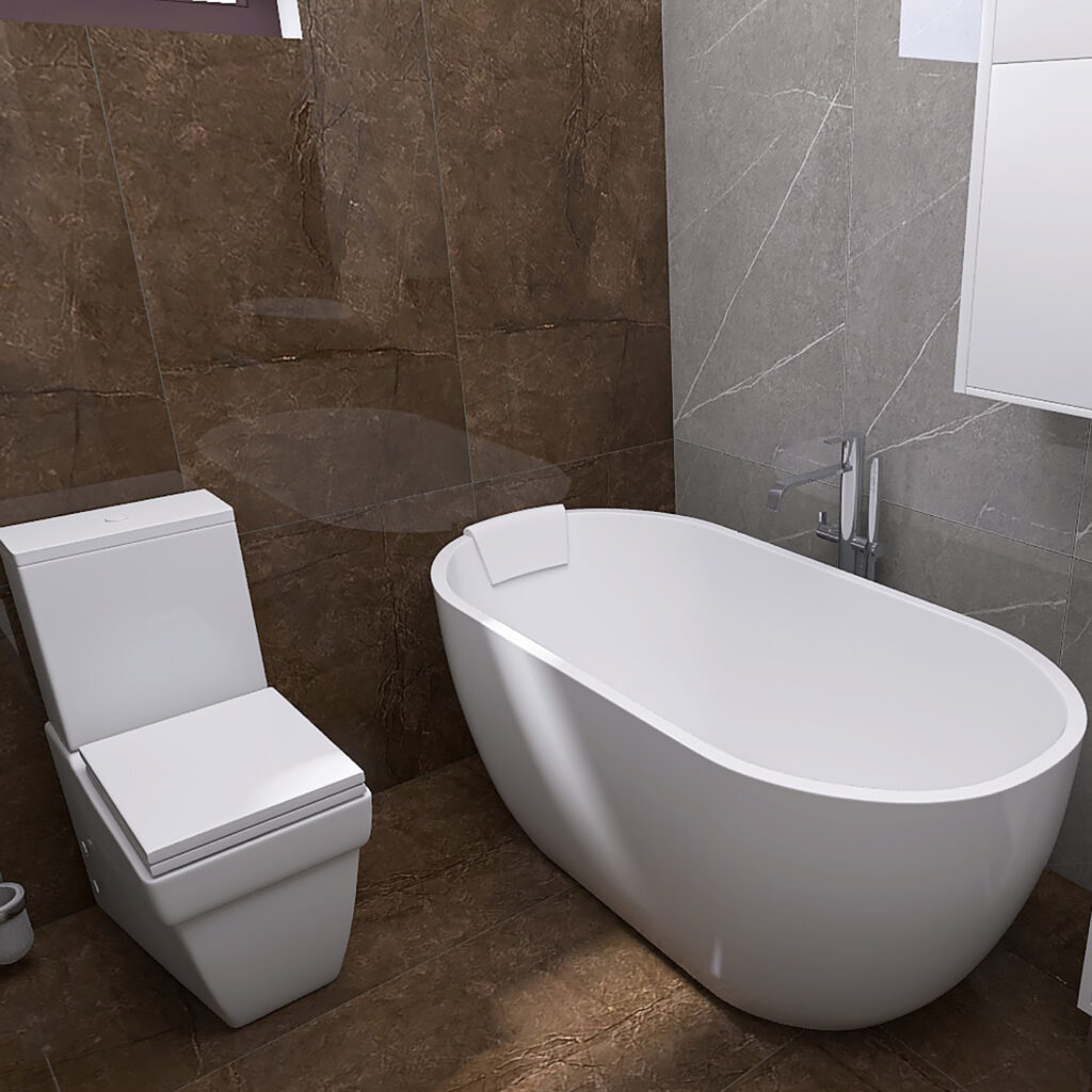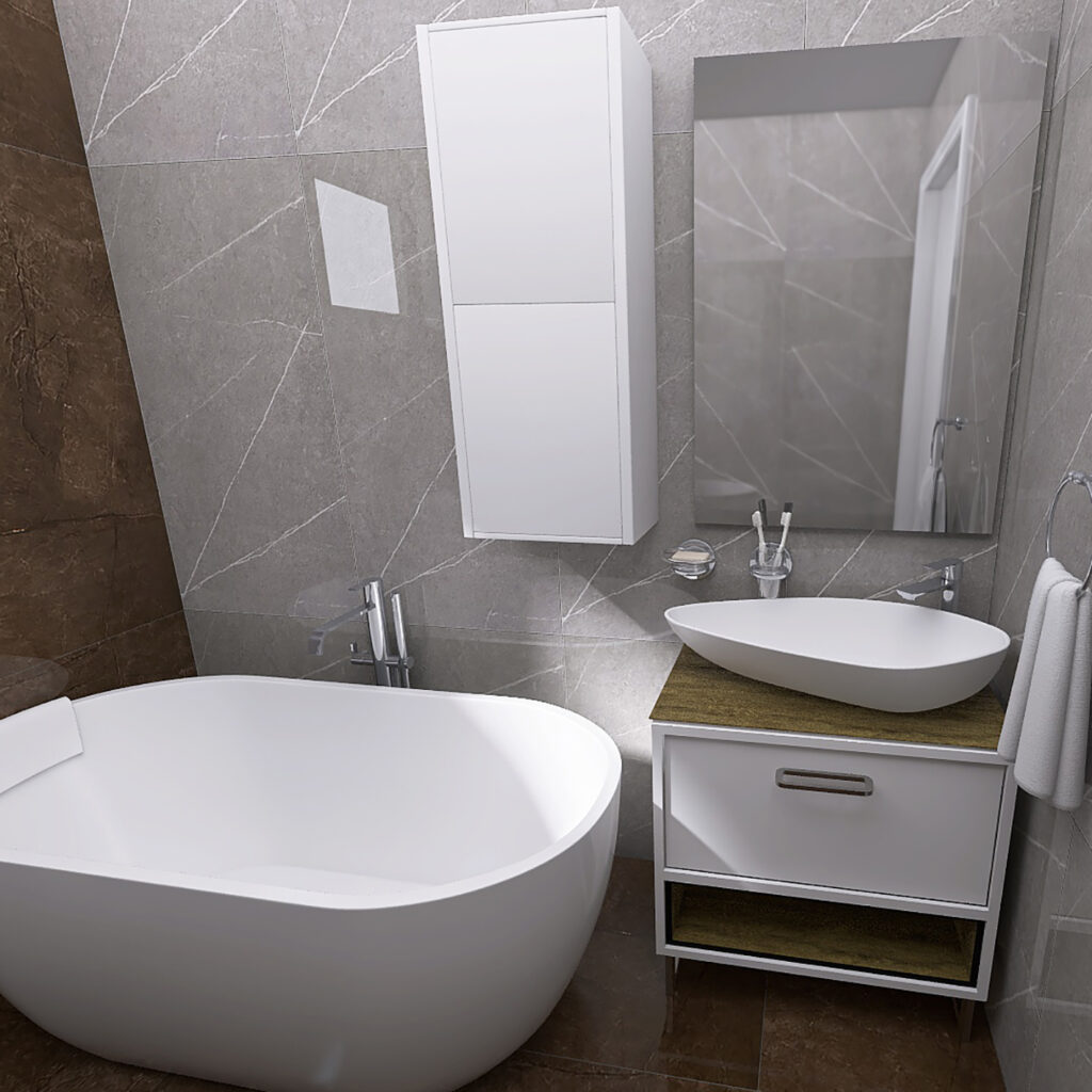 U ovom projektu kupatila dominira sofisticirana kombinacija toplih braon i hladnih sivih tonova. Na podu su postavljene španske pločice Montecoto Marron formata 60×120 cm, koje unose osećaj prirodne topline i dubine u prostor. Zidovi su obloženi velikim pločicama Tactile Grey (59×119 cm), čije fine bele šare dodatno vizuelno proširuju prostor.