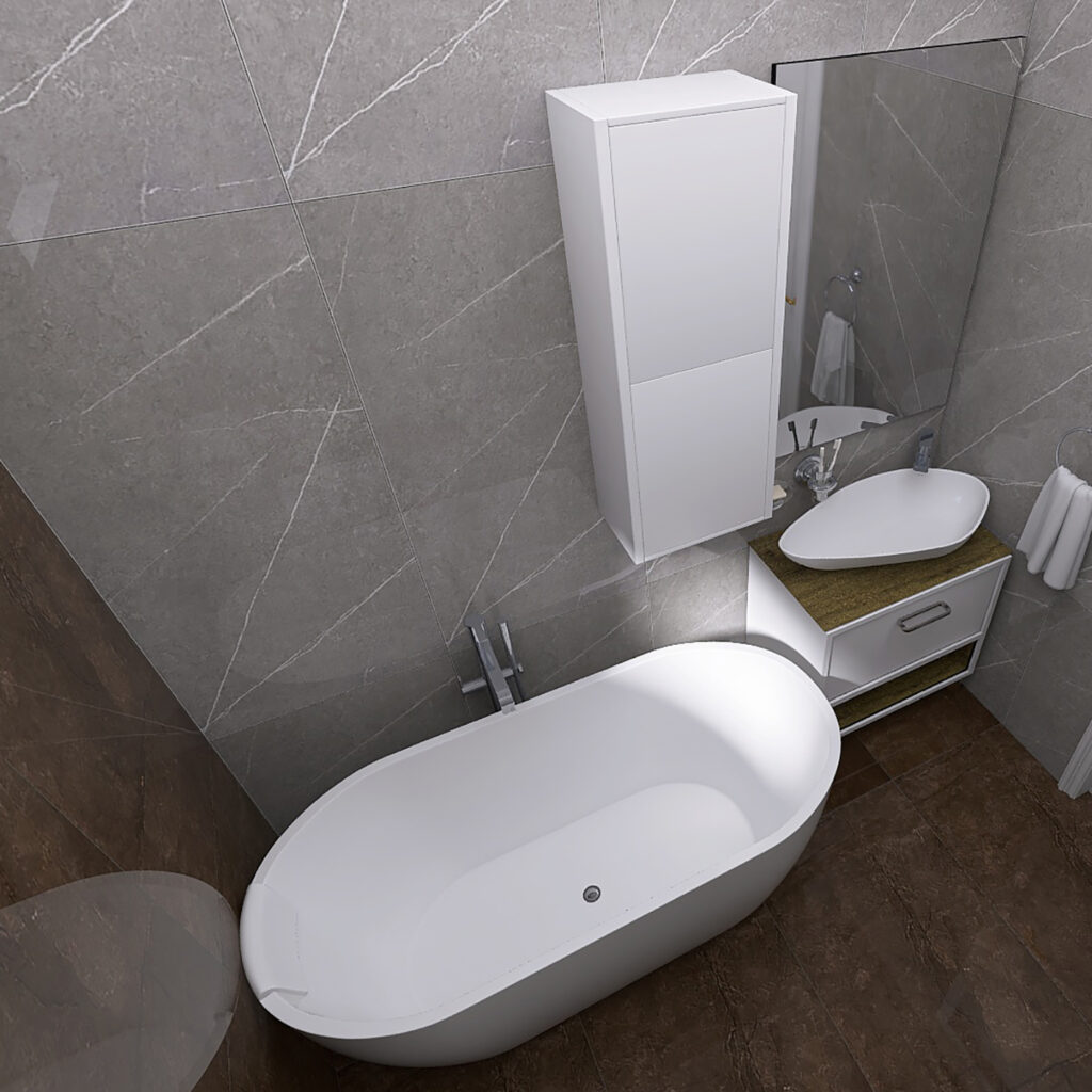 Nameštaj u kupatilu dolazi iz serije Bella Dona, sa visećim ormarićem i elegantnim lavaboom Olive izduženog oblika, postavljenim na radnu ploču u toploj teksturi drveta. Zidno ogledalo i vertikalni element SMC 120 doprinose praktičnosti i modernom karakteru.