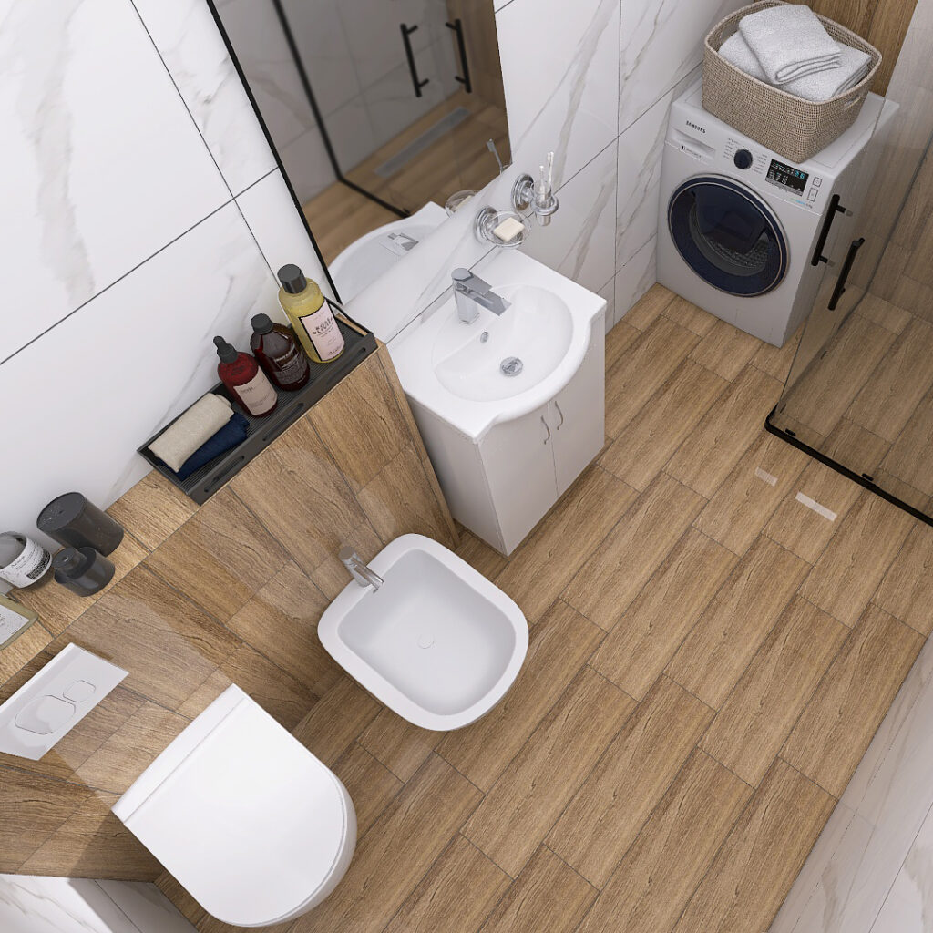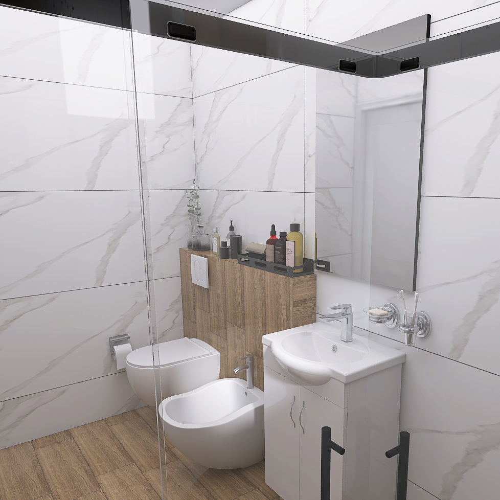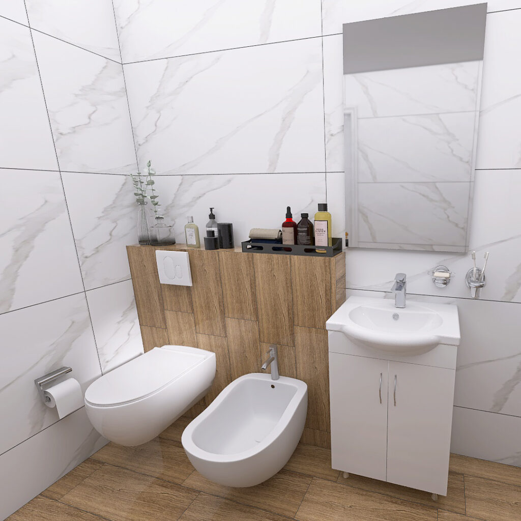 Sanitarije su birane tako da kombinuju funkcionalnost i savremen dizajn. Postavljena je konzolna WC šolja City Rimless sa odgovarajućim ugradnim vodokotlićem i slim daskom, dok komplet upotpunjuju City konzolni bide sa Smart baterijom. Praktičnost prostora dodatno naglašava kupatilski nameštaj Trend DB 55 – New Classic sa Hilton ogledalom i modernom baterijom Aroha.