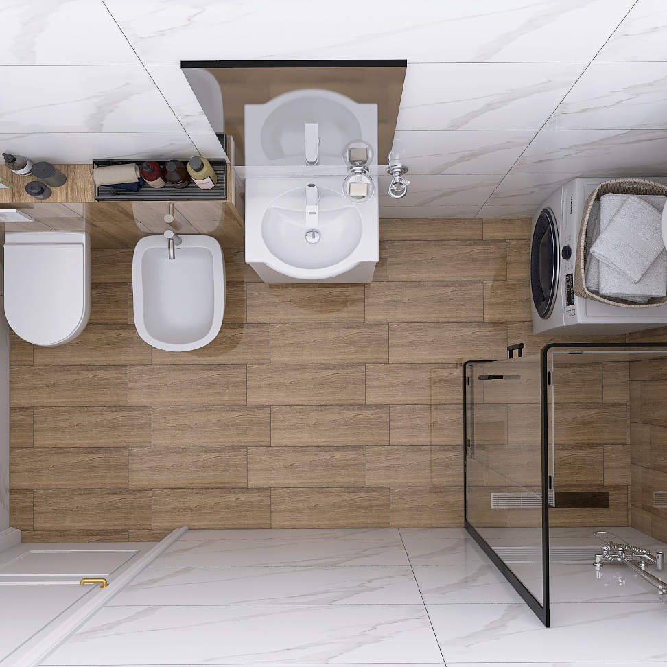U ovom projektu kupatila akcenat je stavljen na skladnu kombinaciju toplih tonova drveta i elegantne mermerne bele. Zidovi su obloženi pločicama Duomo Blanco 60×120, čija luksuzna mermerna struktura prostoru daje osećaj prostranosti i svetline. Na podu i u tuš kabini korišćene su pločice Ebano Natural 20,5×61,5, koje imitiraju teksturu drveta i unose toplinu u ambijent.