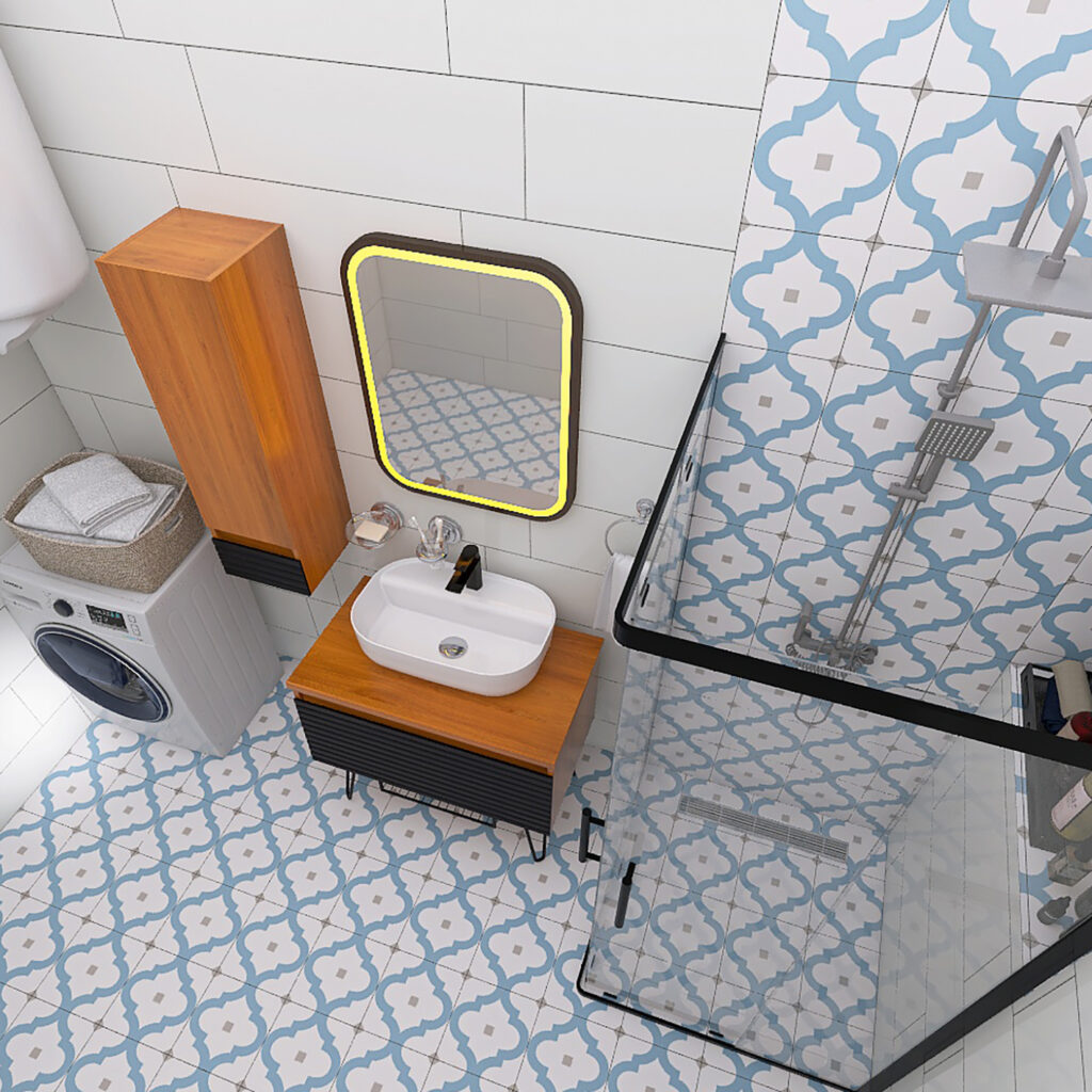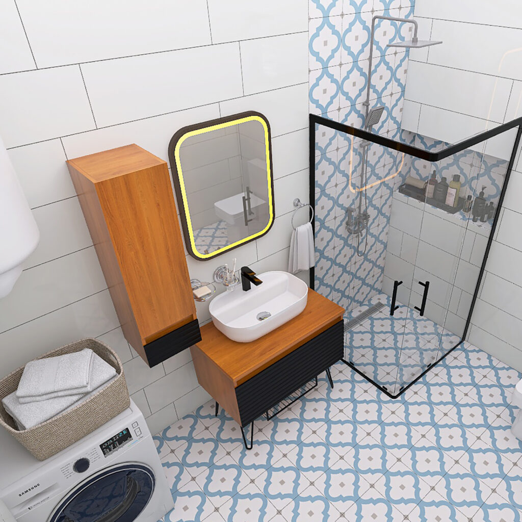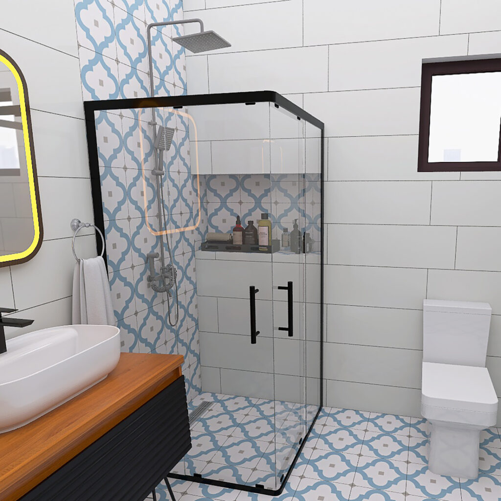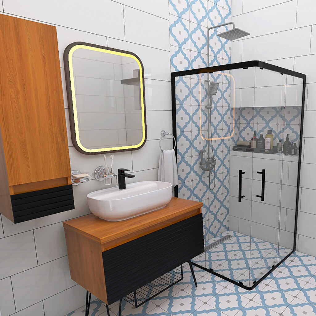 Predstavljamo Vam 3D projekat kupatila koje je uredjeno u rustičnom stilu. Za zidove ovog kupatila, koristli smo pločice Blanco brillo, dok smo na podu i kao dekor koristli Španske pločice Barcelona Greco. Ove pločice proizvodi Keros keramika. Naša preporuka je da se prilikom lepljenja pločica koristi lepak Adesilex, koji pripada italijanskom brendu Mapei. Dok se za fugovanje preporučuje Keracolor FF, od istog proizvođača. Od sanitarije opredelili smo se za brendove Cerastyle i Diplon. Tuš kabina je u dimenziji 80x80cm, sa crnim okvirom i kaljenim providnim staklom, debljine 6mm. Monoblok, wc daska, i umivaonik proizvodi Cerastyle. Šolja i wc daska su iz serije Noura, dok je lavabo iz serije Aqua. Ormarić Taylan DB, dolazi u kompletu sa umivaonikom dok je ogledalo sa LED svetlom i dolazi iz iste serije nameštaja. Oba proizvoda pridaju našem brendu nameštaja Bellezza. Baterija za umivaonik, Azure, je u crnoj boji i proizvodi je Adell. Usponski tuš King, dolazi u kompletu sa baterijom i ručnim tušem. Bojler je od 80 litara i proizvodi ga Elit Inox iz Čačka. Kupatilska galanterija iz ovog 3D projekta je odabrana iz našeg online web shopa.