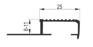 Aluminijumski stepenišni reljefni profil 320. Aluminijumski stepenišni profil 320 je namenjen za zaštitu ivice stepeništa. Stepenišni reljefni profil 320 se postavlja prilikom ugradnje keramičkih obloga na stepenište, a montaža se vrši uglavnom lepkovima za keramiku. Profil je namenjen za keramičke obloge od 8mm do 10mm debljine i pokriva čeoni i gazišni deo stepenika. Gazišni deo profila je reljefna površina koja povećava protiv klizno dejstvo. Završna obrada stepenišnog 320 profila je proces hemijske eloksaže.