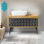 Boja/dezen: bela (umivaonik), boja drveta (hrast) sa crnim detaljima, lakirano, sjajna.