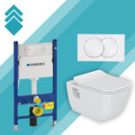 Ovaj komplet „Set Aqua 4u1“ sadrži: Konzolnu šolju + WC dasku + ugradni vodokotlić GEBERIT + tipku