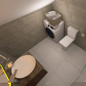 U ovom 3D projektu kupatila primenjene su pločice u sivim i belim tonovima u kombinaciji sa modernim kupatilskim nameštajem i sanitarijama. Primenom crnih slavina prostoru se dodaje doza luksuza. Nazivi…